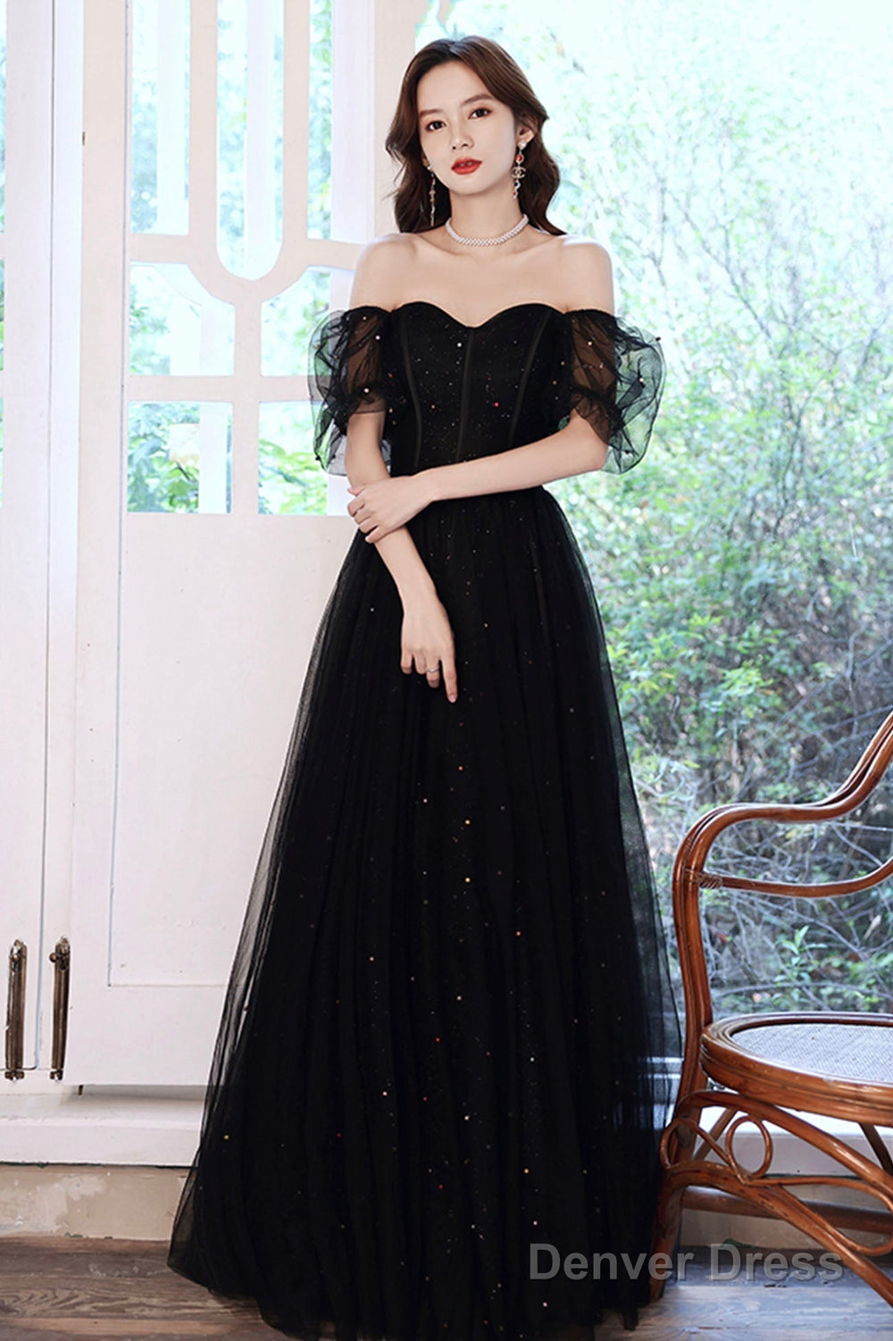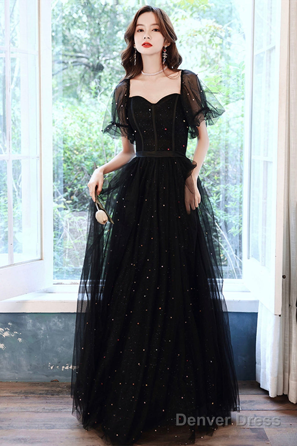 Black Tulle Sequins Long Prom Dress, Black Short Sleeve Evening Dress