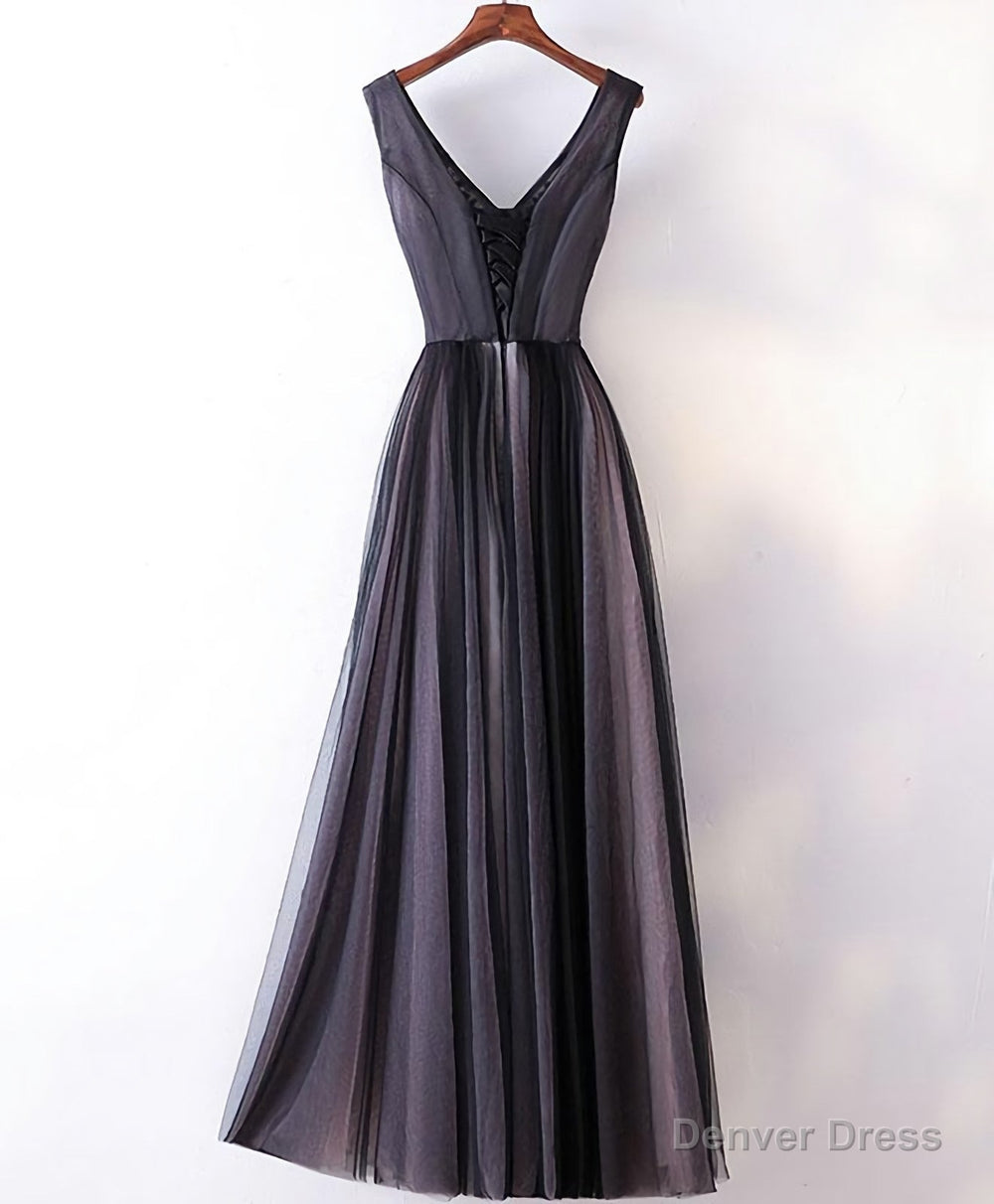 Black V Neck Lace Applique Tulle Long Prom Dress, Black Evening Dress