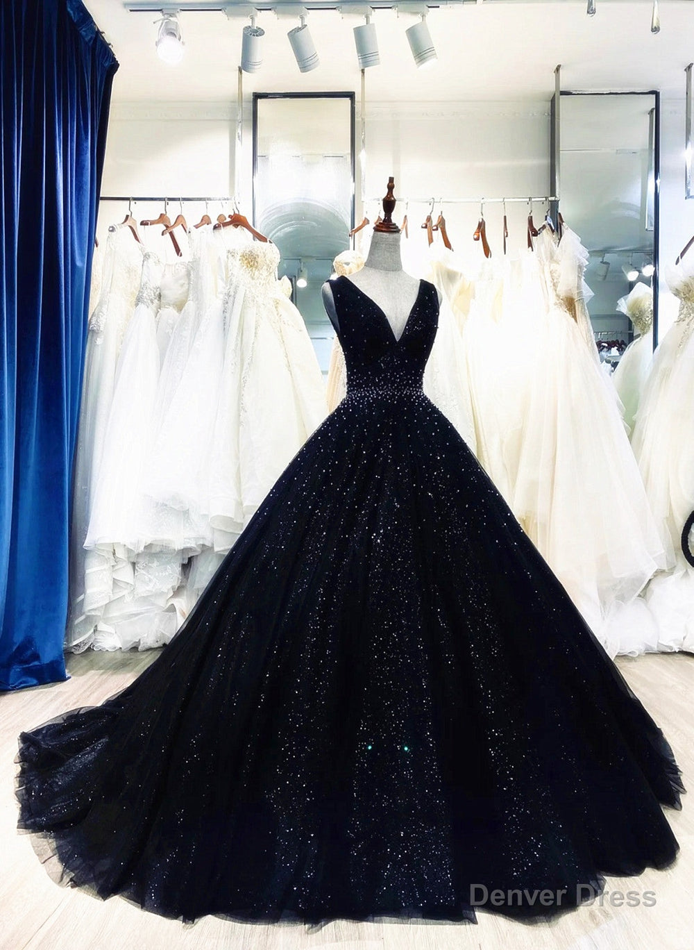 Black V-neckline Shiny Tulle Beaded Sweet 16 Dress, Black Formal Dress