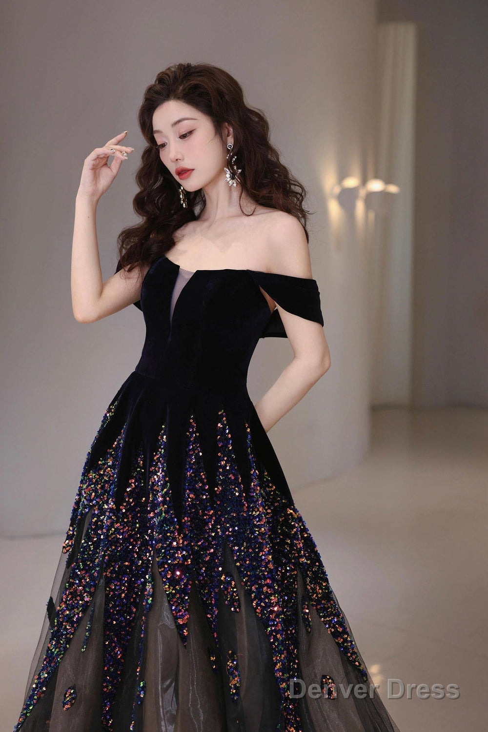 Black Velvet Sequins Long Prom Dress, Beautiful A-Line Tulle Party Dress