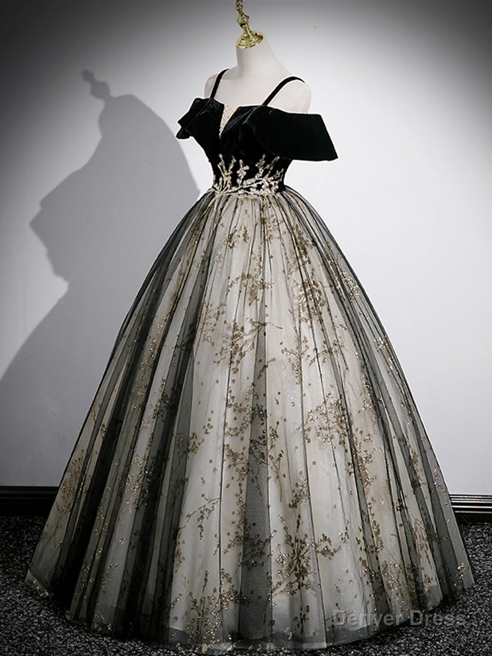 Black Velvet Tulle Sequins Floor Length Prom Dress, Off the Shoulder Evening Party Dress