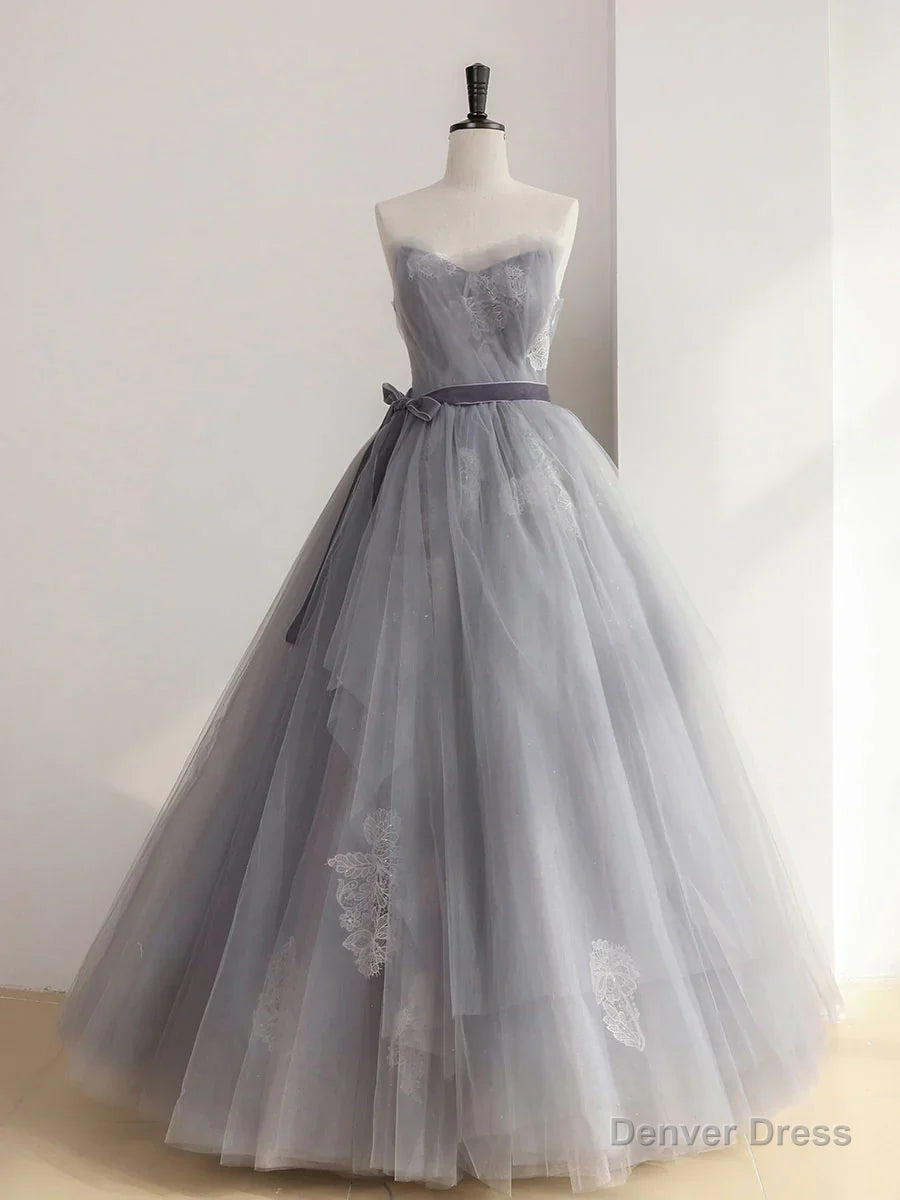 A Line Strapless Appliques Gray Tulle Long Prom Dress Evening Dress