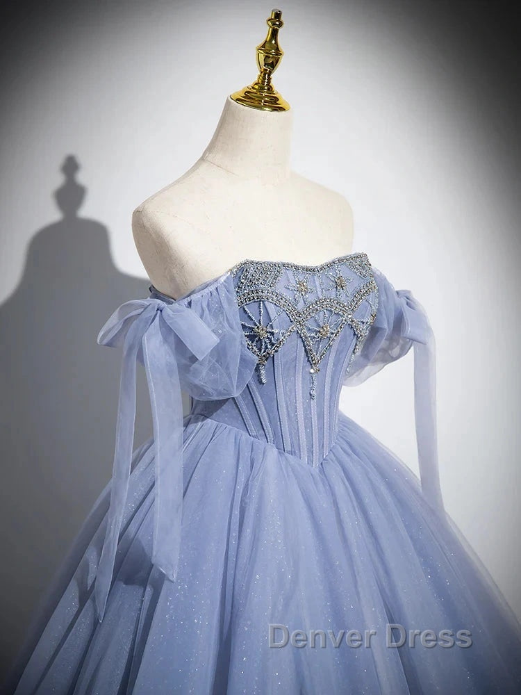 Blue A-Line Tulle Beads Long Prom Dresses, Blue Long Formal Dresses