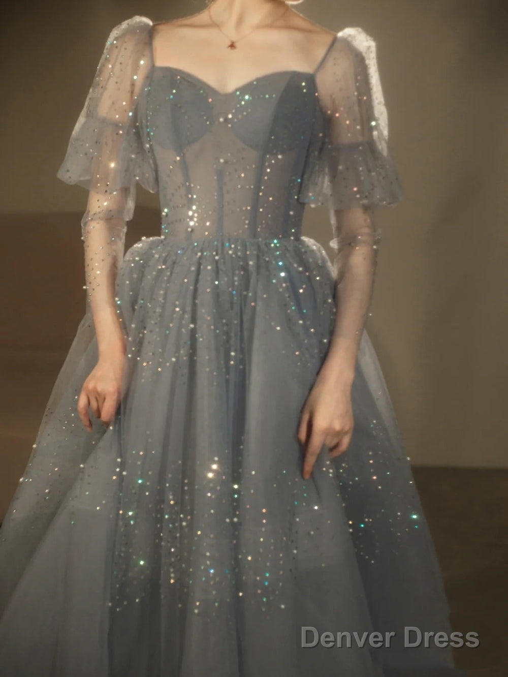 Blue Beaded A-Line Tulle Long Party Dress, Blue Evening Dress Prom Dress