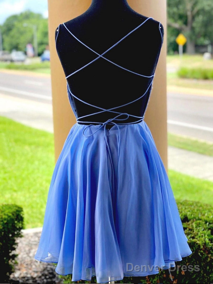 Blue Chiffon Beads Backless Short Prom Dress, Blue Homecoming Dress