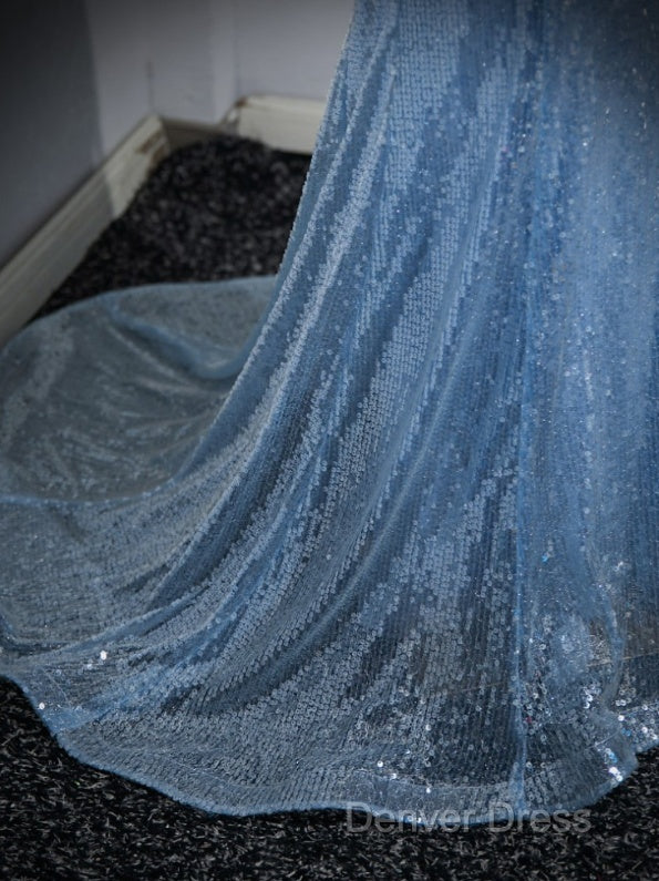 Blue Mermaid Sequin Sheer Straps Scalloped Long Prom Dresses