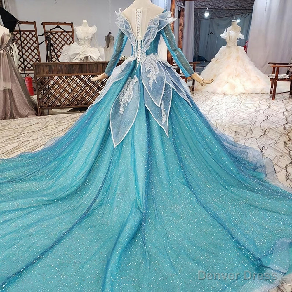 Blue Princess Sparkle Frost Fairy Queen Costume Wedding Dress, Bridal Ball Gown Long Sleeve Long Train Cosplay Off The Shoulder