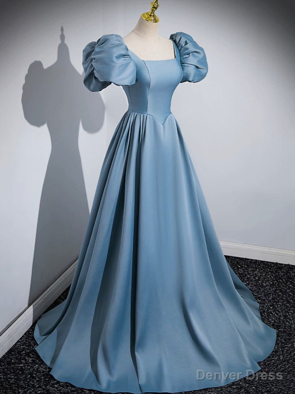 Blue Puff Sleeve Satin Floor Length Prom Dress, Blue A-Line Evening Party Dress