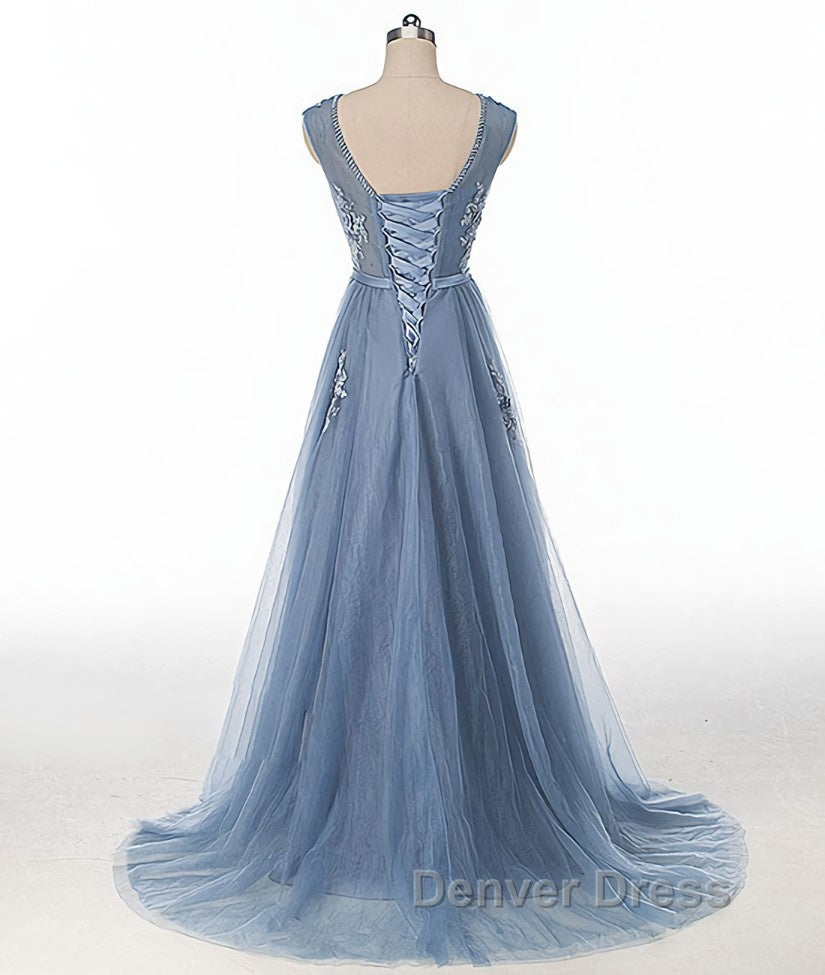 Blue round neck tulle lace applique long prom Dresses, blue evening Dresses