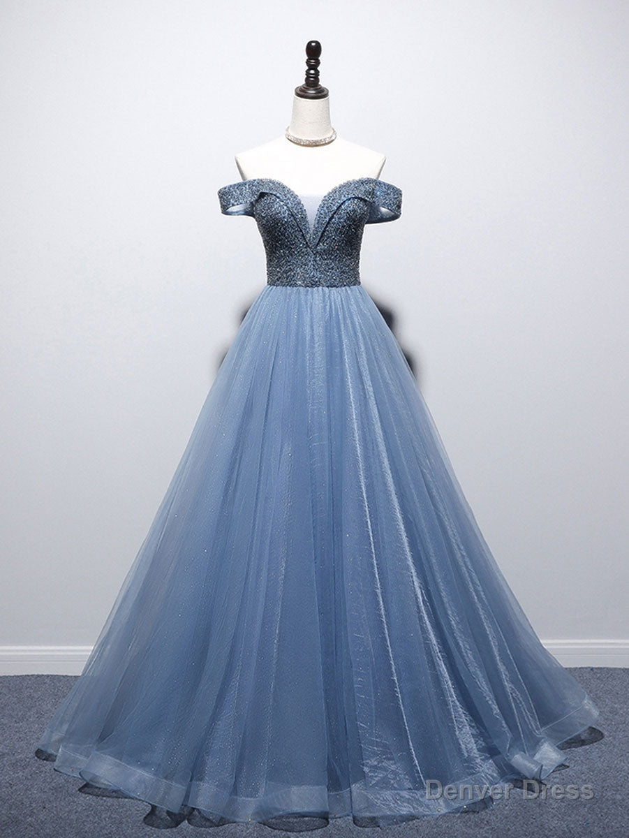 Blue Sweetheart Neck Beads Long Prom Dress, Blue Tulle Formal Dress With Beading Sequin