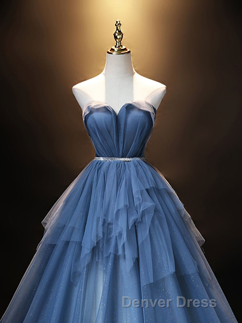 Blue Sweetheart Neck Tulle Long Prom Dresses, Blue Evening Dresses