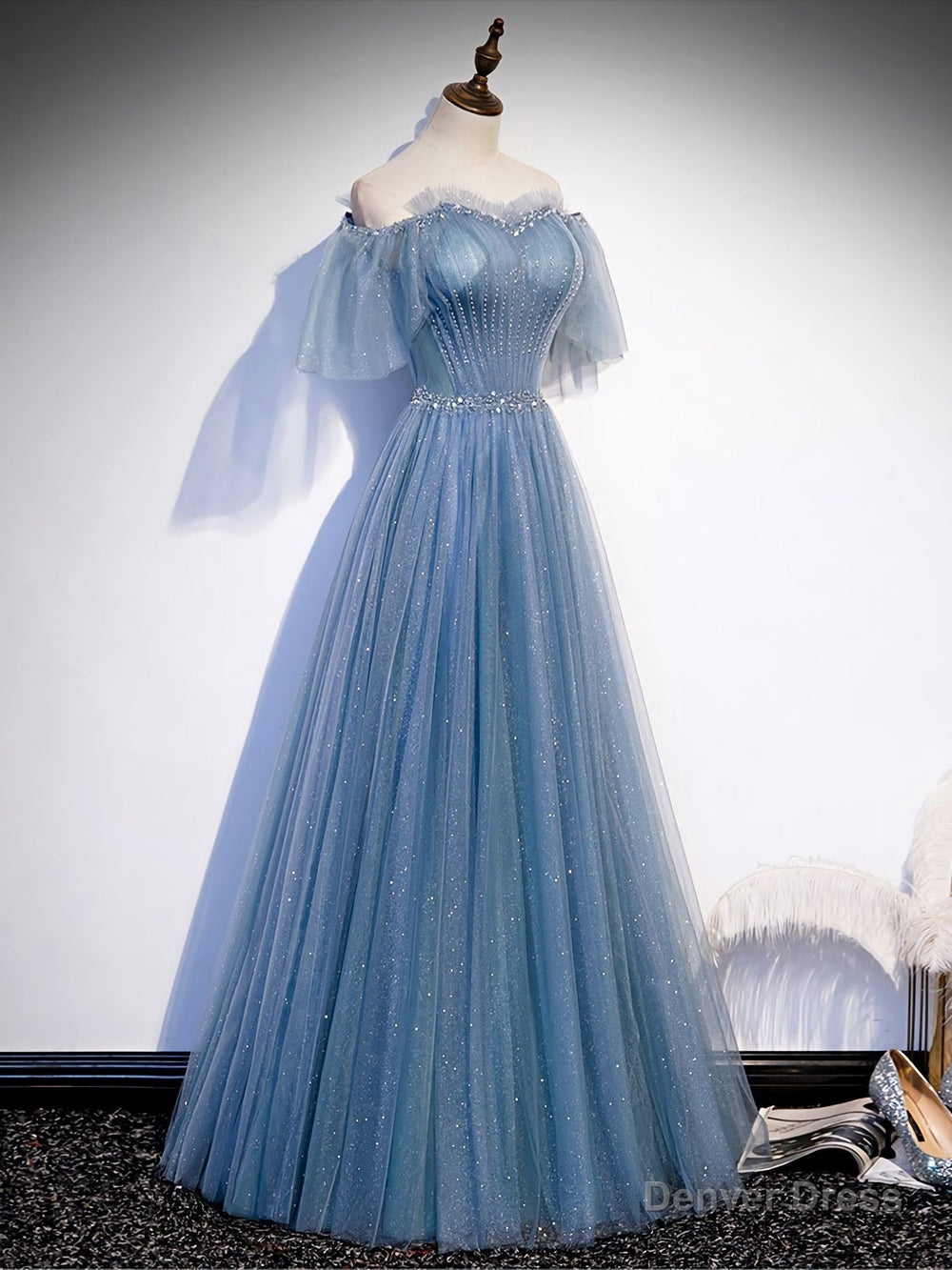 Blue Sweetheart Tulle Sequin Long Prom Dress, Blue Formal Dress, 1