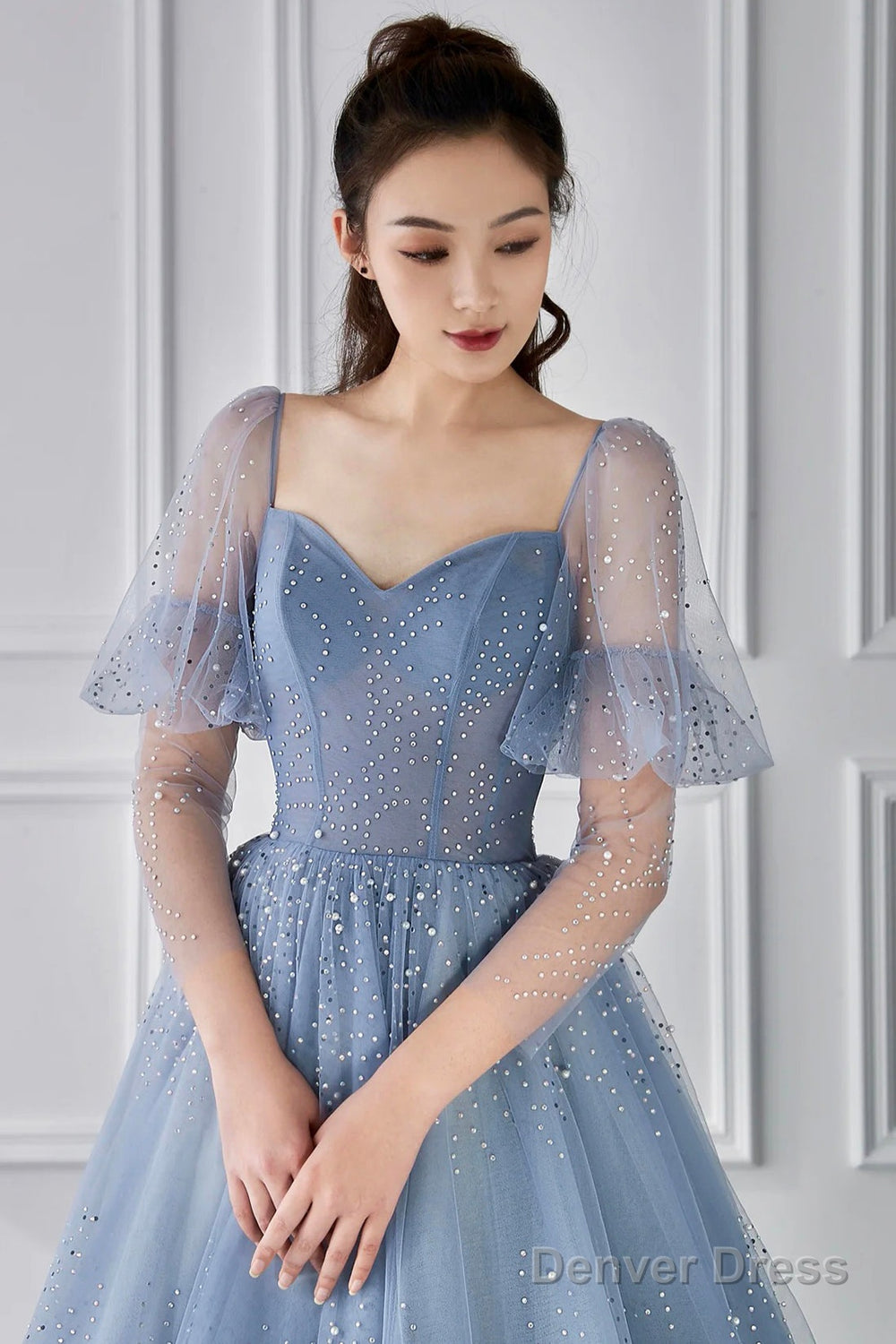 Blue Tulle Beaded Long Sleeve Prom Dress, A-Line Blue Evening Party Dress
