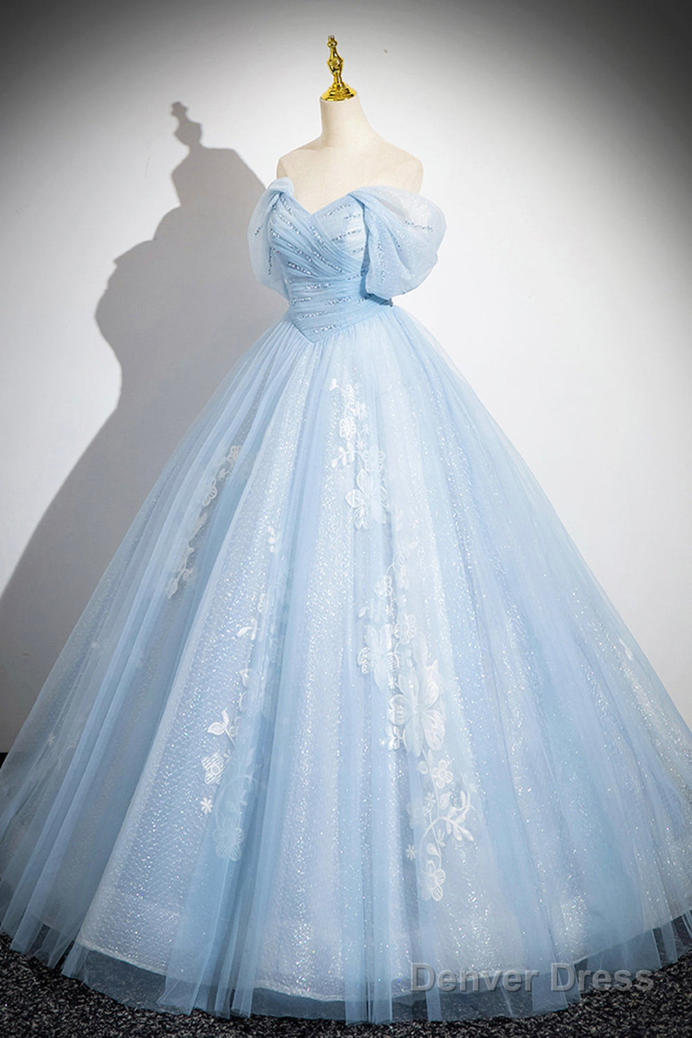 Blue Tulle Lace Long Prom Dress, Off The Shoulder Evening Party Dress