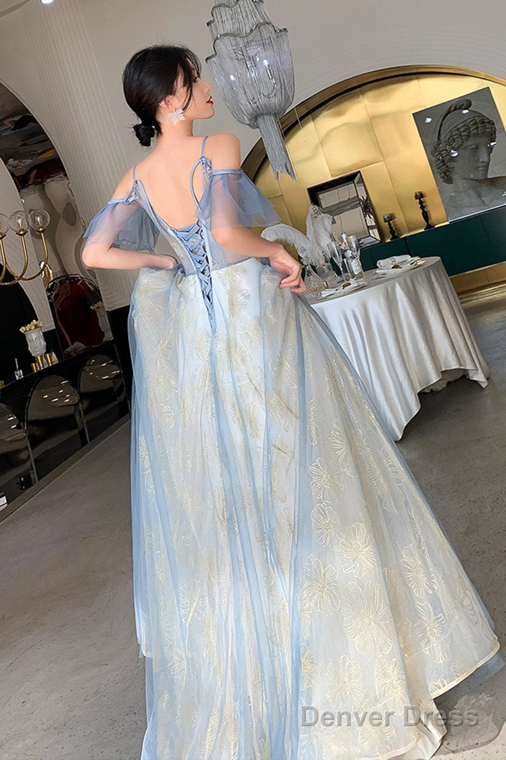 Blue Tulle Long A-Line Prom Dress, Beautiful Sequins Evening Graduation Dress