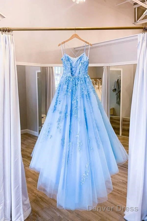Blue Tulle Long Backless A Line Prom Dress Evening Dress
