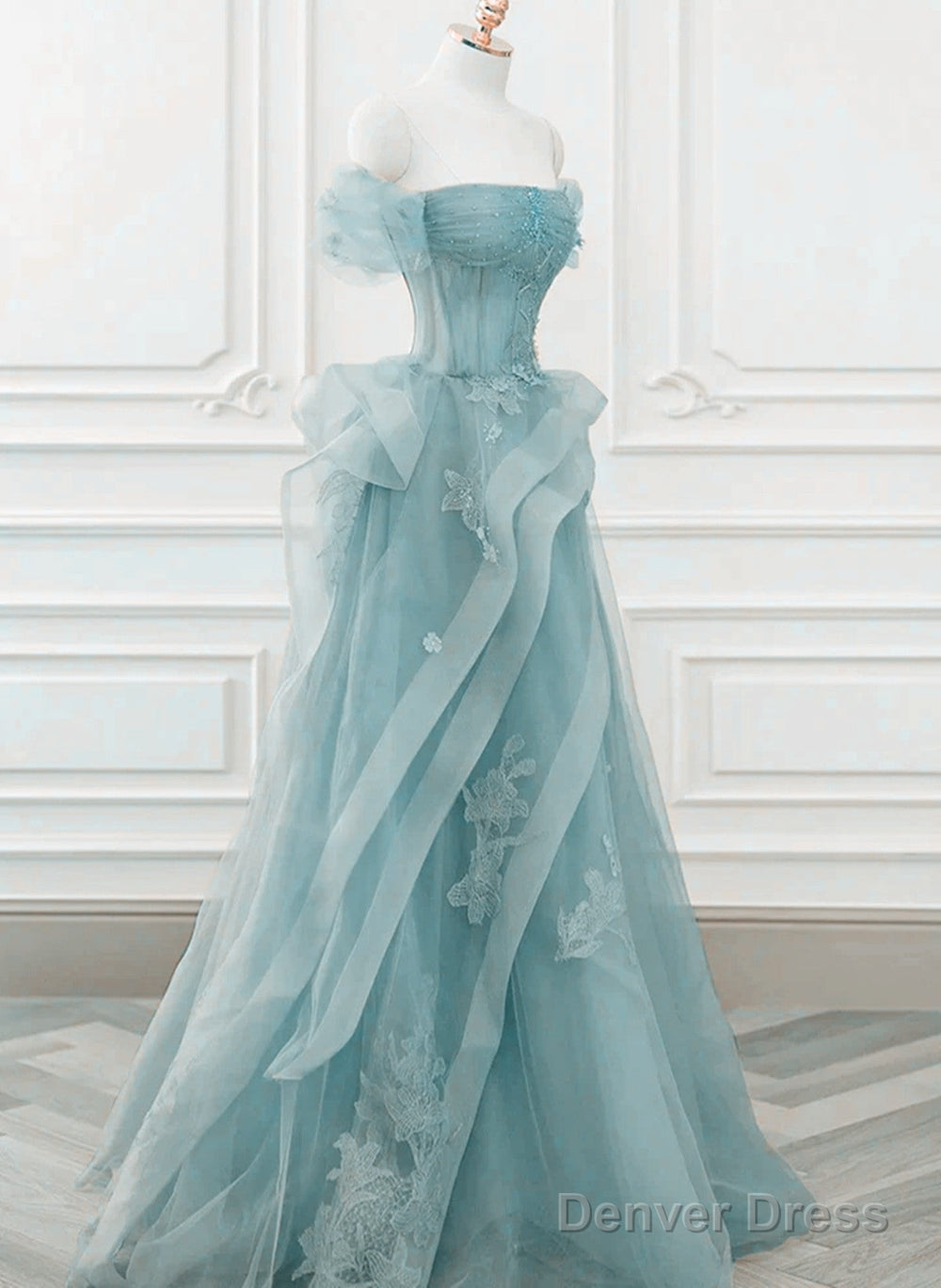 Blue Tulle Off Shoulder Beaded Lace Long Prom Dress, Blue Formal Dress