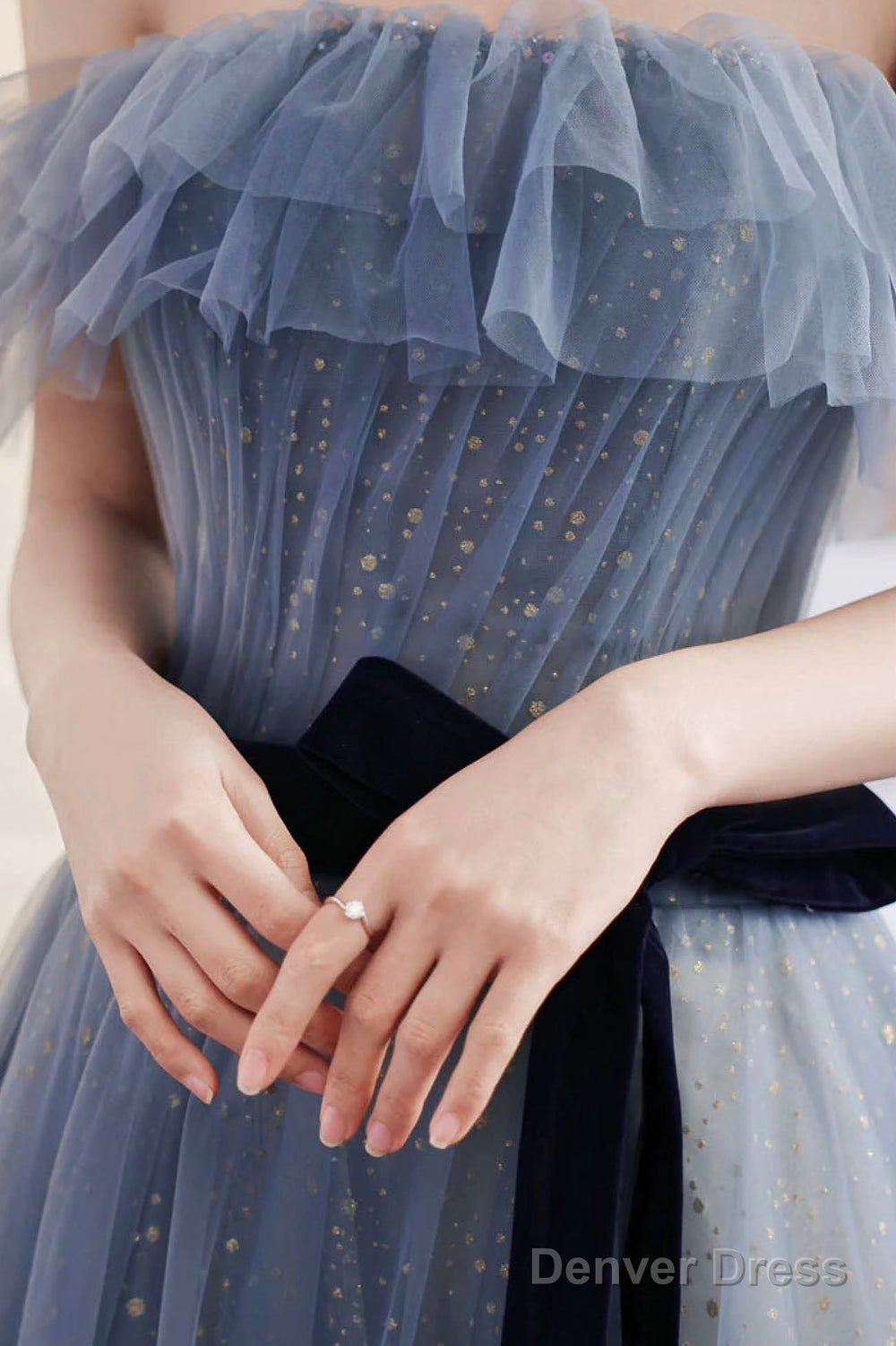 Blue Tulle Off Shoulder Long Formal Dress With Bow, A-Line Evening Gown