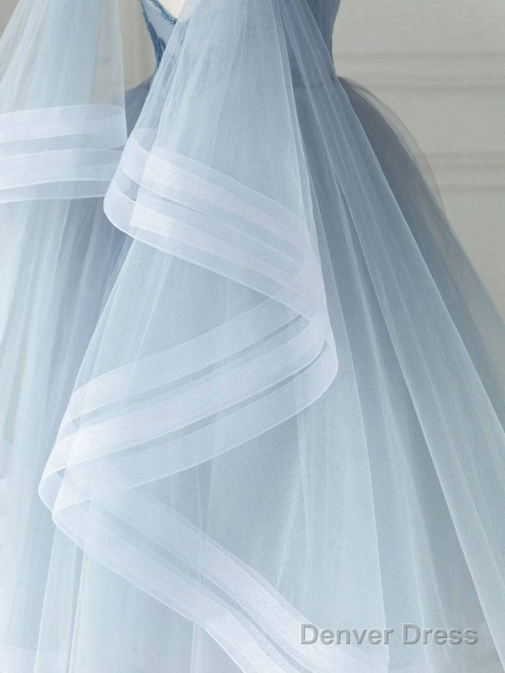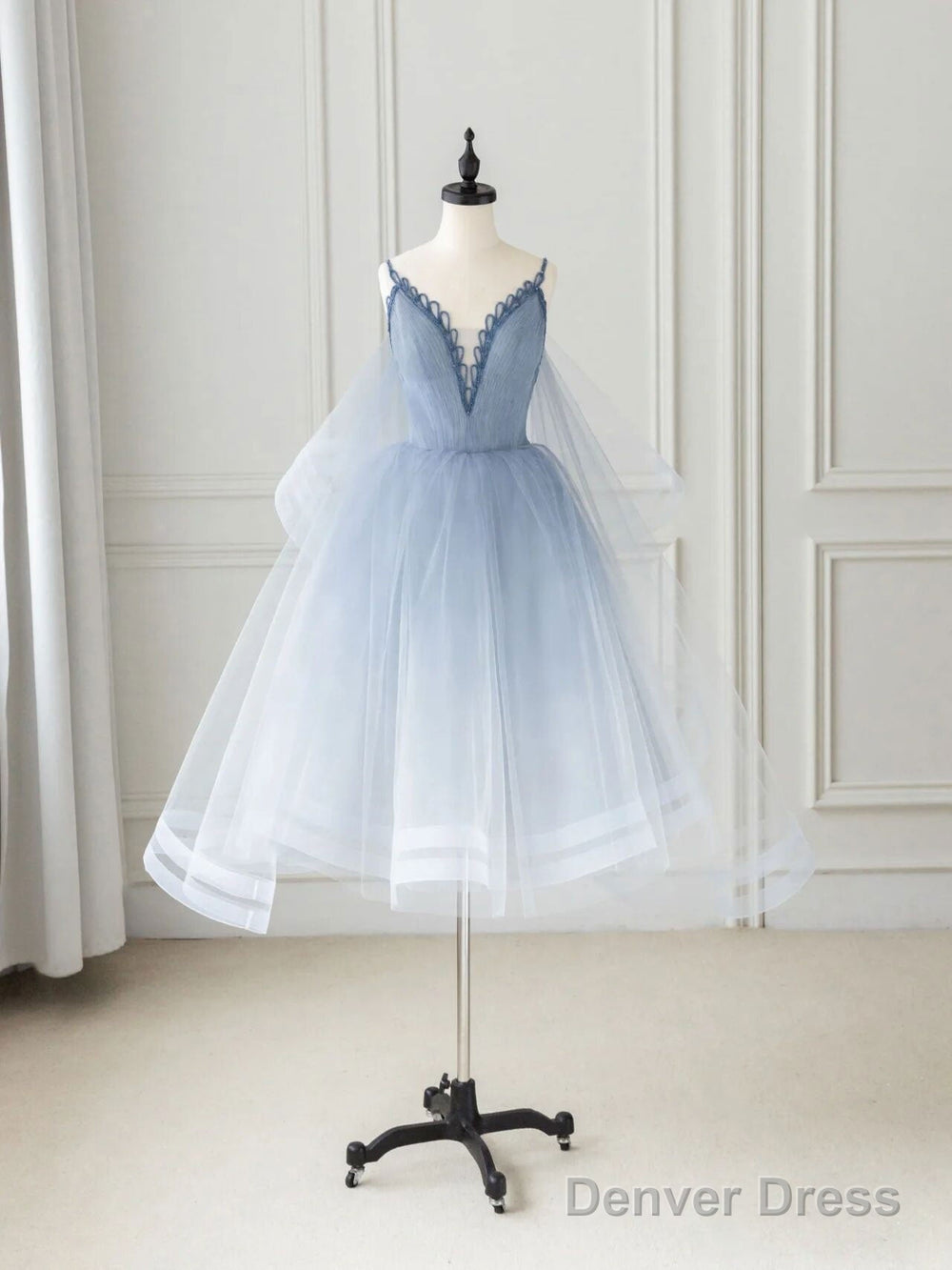 Blue V Neck Tulle Beads Short Prom Dress, Blue Tulle Formal Dress