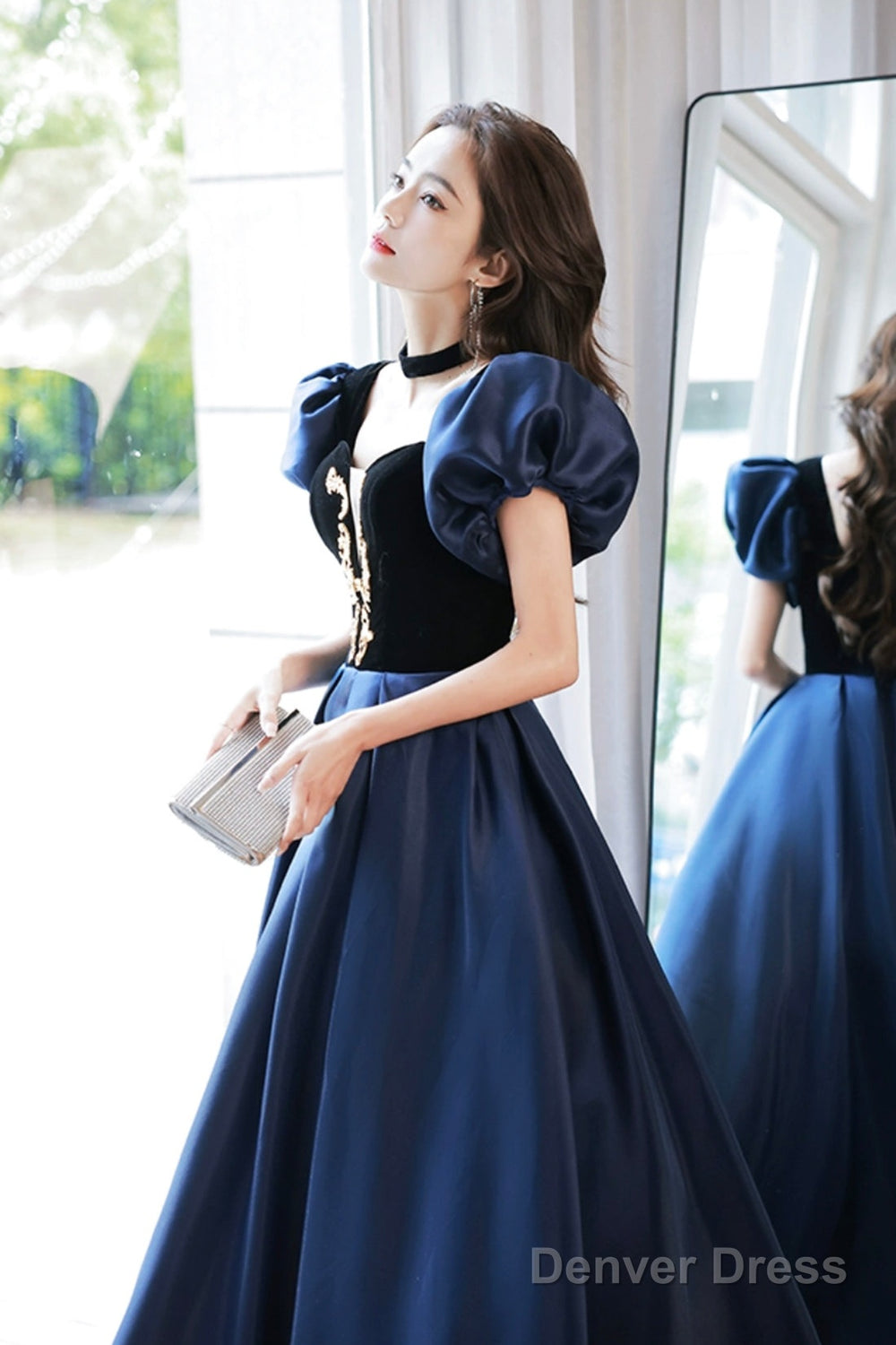 Blue Velvet And Satin Floor Length Prom Dress, Elegant Short Sleeve Evening Party Dress