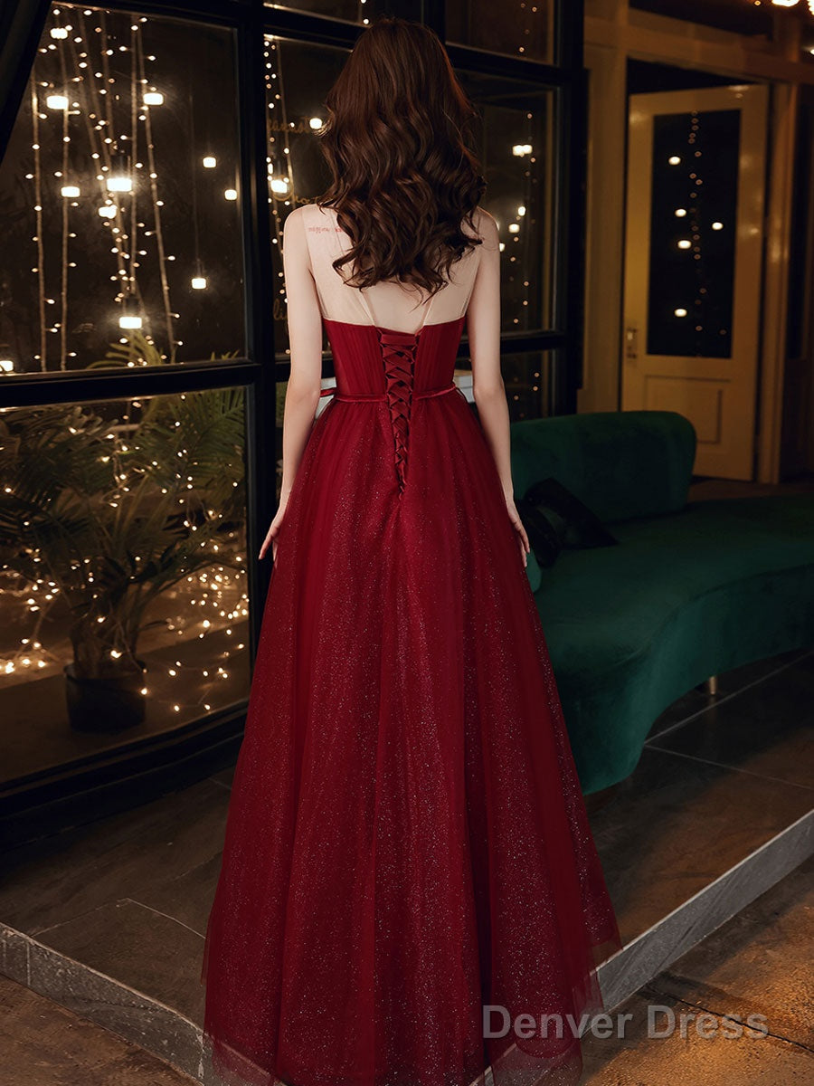 Burgundy A Line Tulle Sequin Long Prom Dress, Burgundy Evening Dress