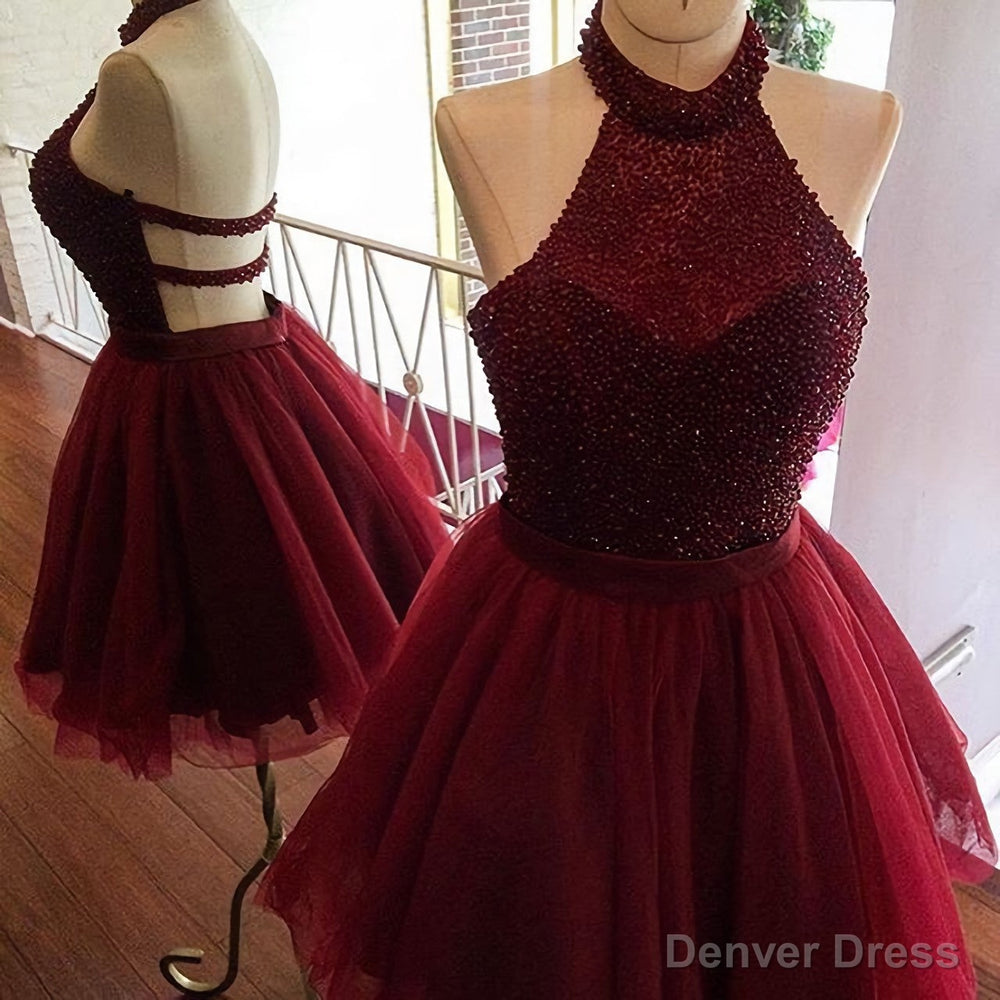 burgundy short halter sparkly semi beaded Homecoming Dresses