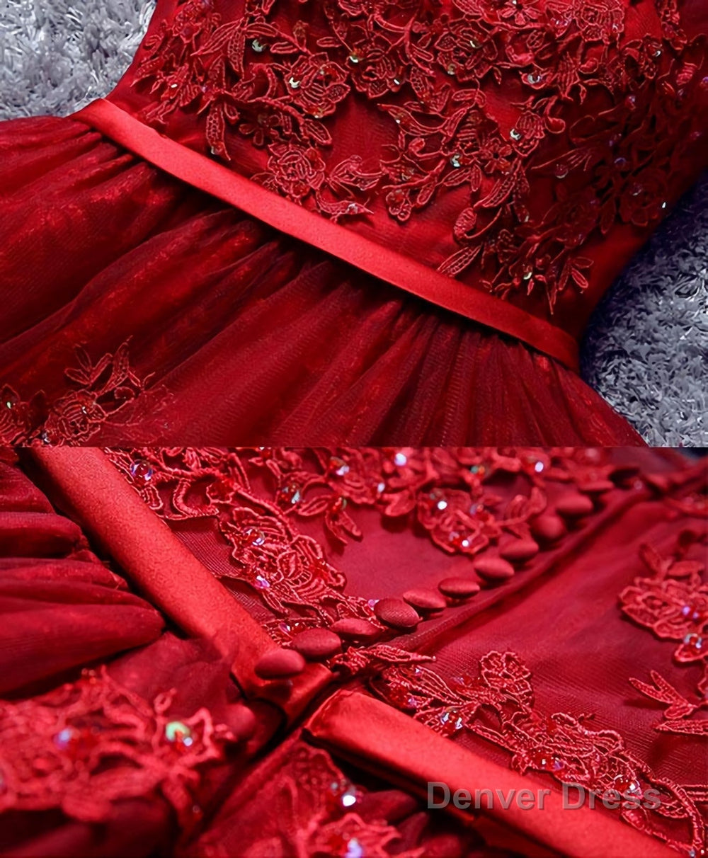 Burgundy Lace Tulle Short Prom Dress, Lace Evening Dress