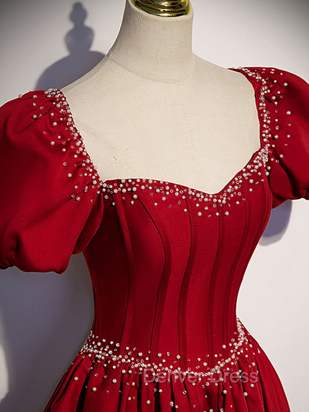 Burgundy Satin Beads Long Prom Dresses, Burgundy Long Formal Dresses