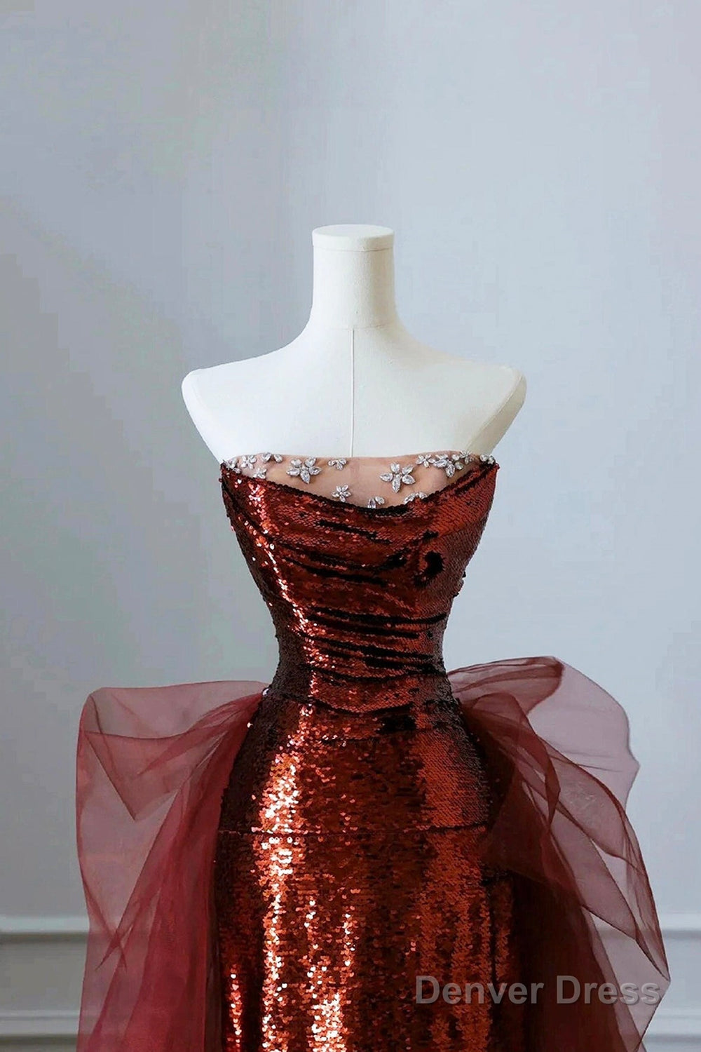 Burgundy Sequins And Tulle Long Formal Dress, Elegant Strapless Evening Party Dress