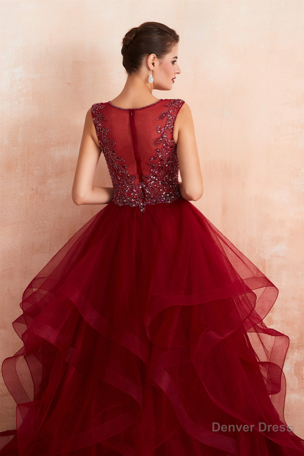 Burgundy Sleeveless Aline Puffy Tulle Prom Dresses with Sequins