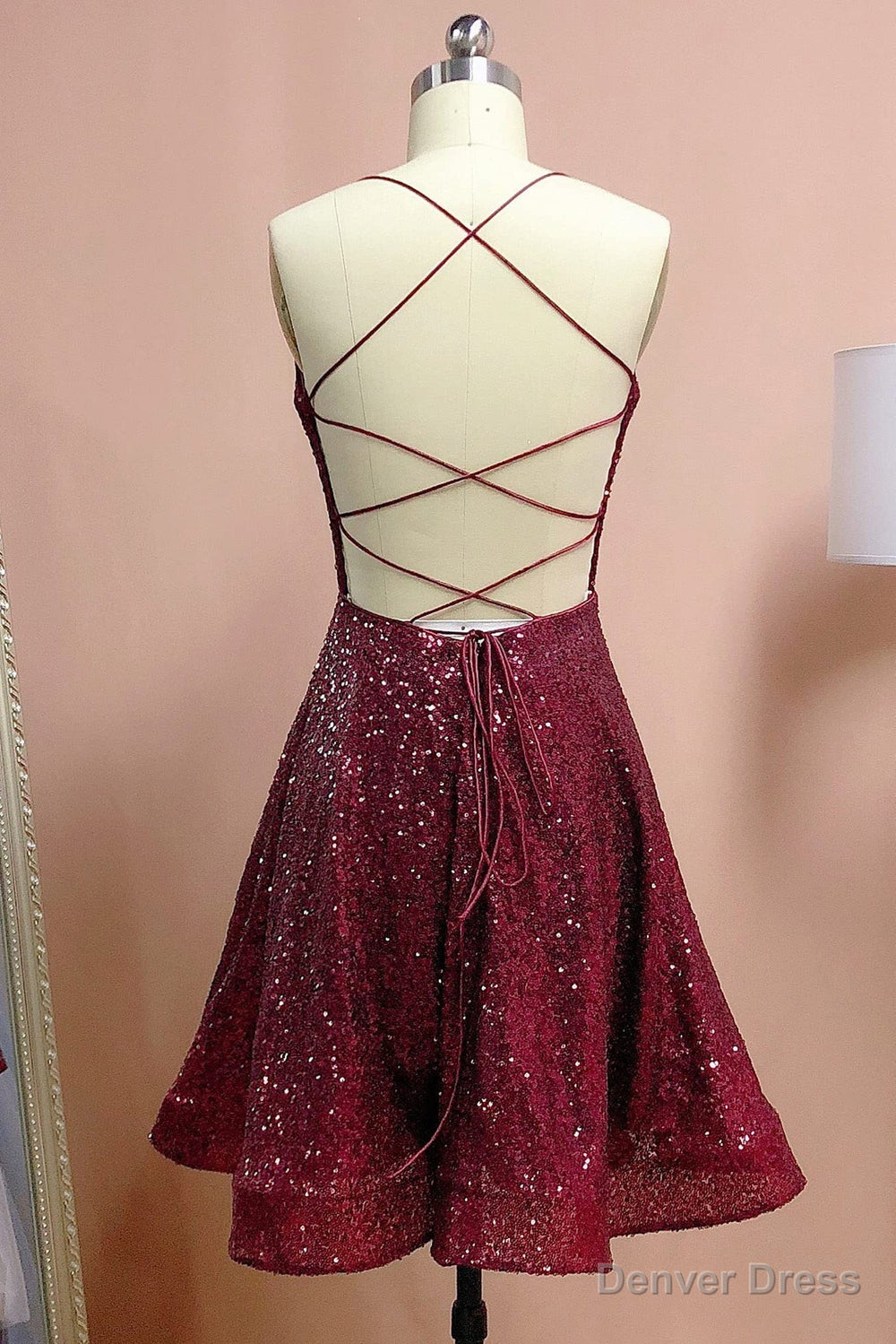 Burgundy Spaghetti Straps Sleeveless A Line Sequins Homecoming Dresses