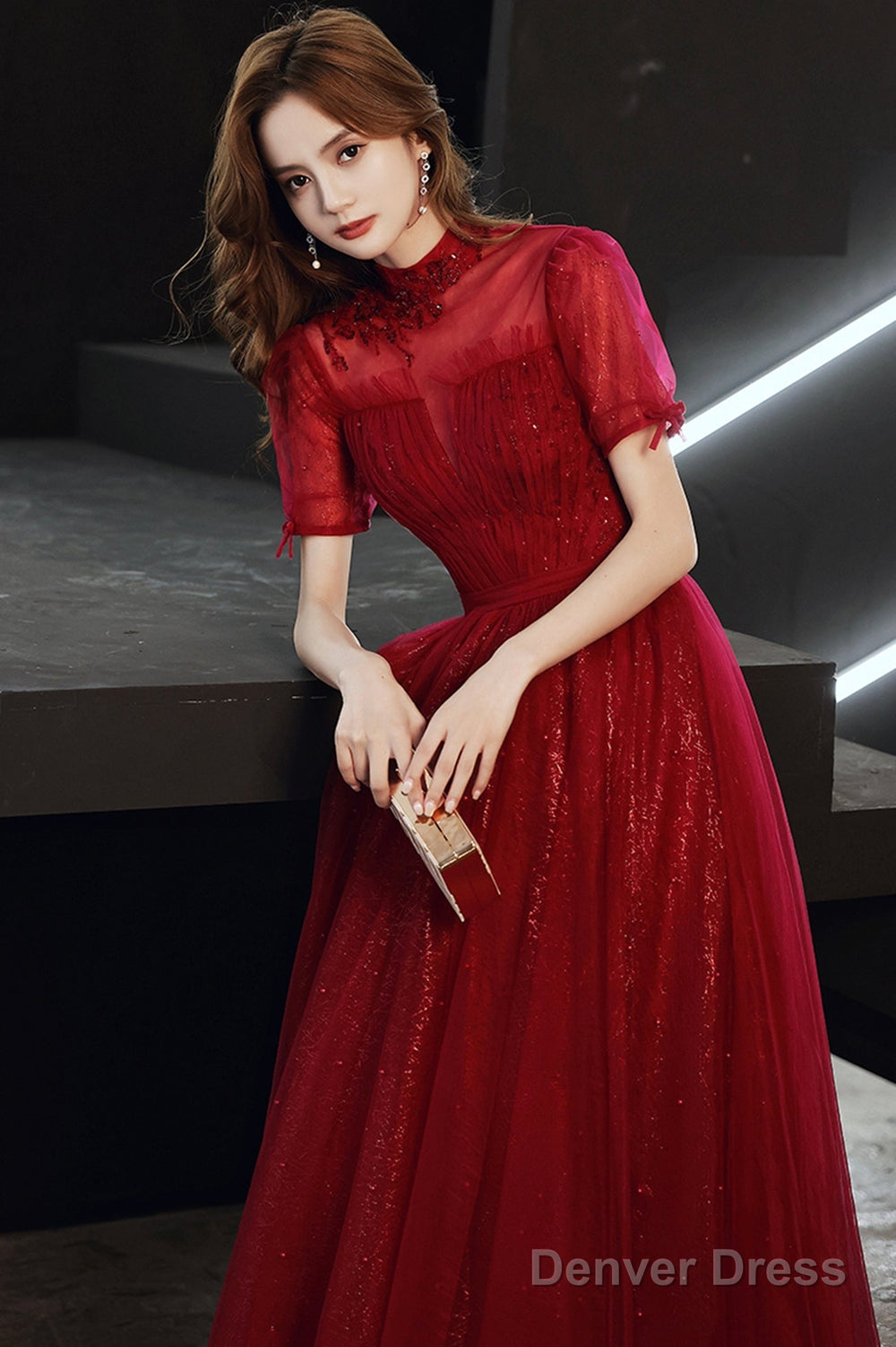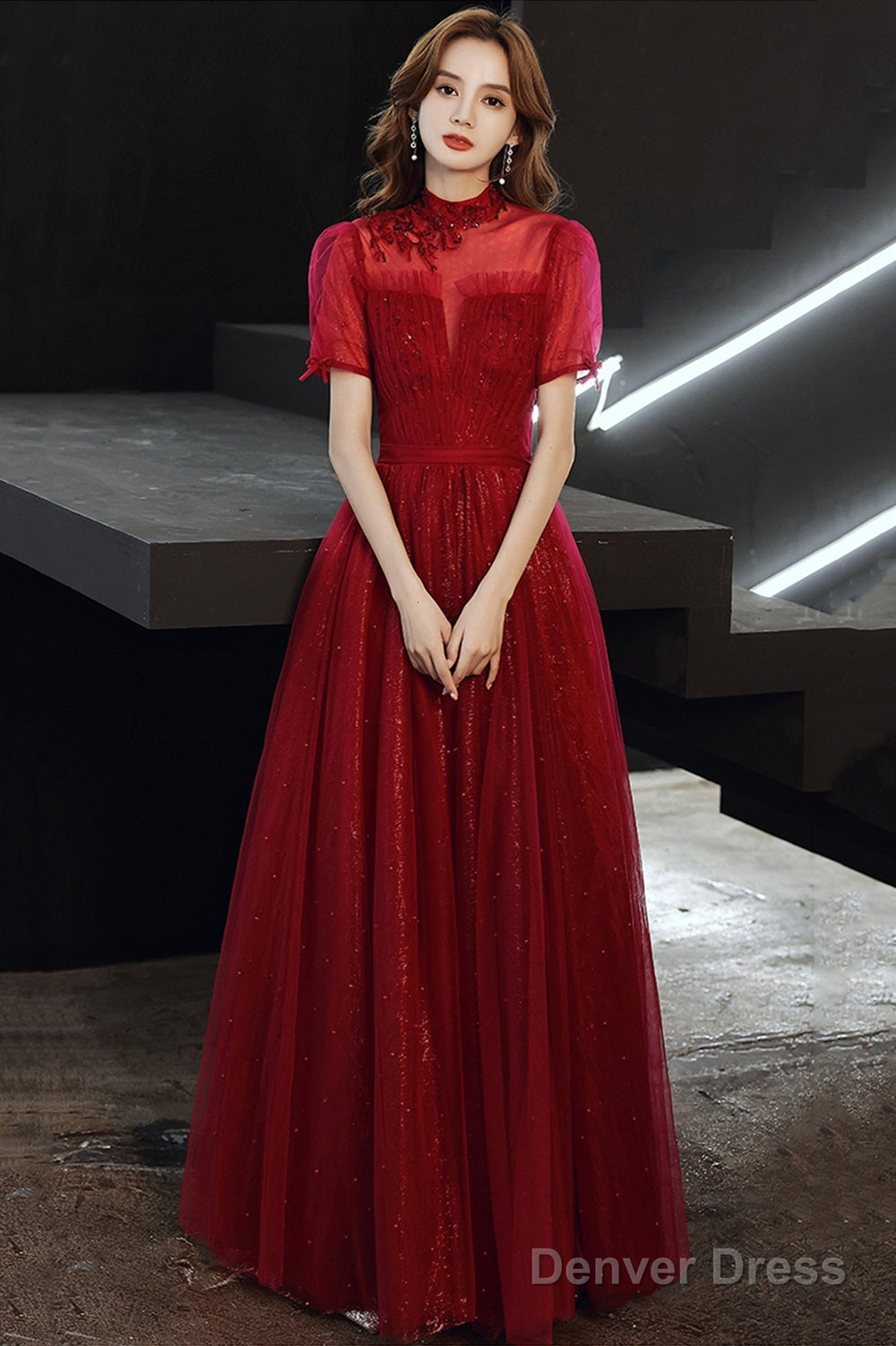 Burgundy Tulle Long A-Line Prom Dress, Burgundy Lace Evening Dress