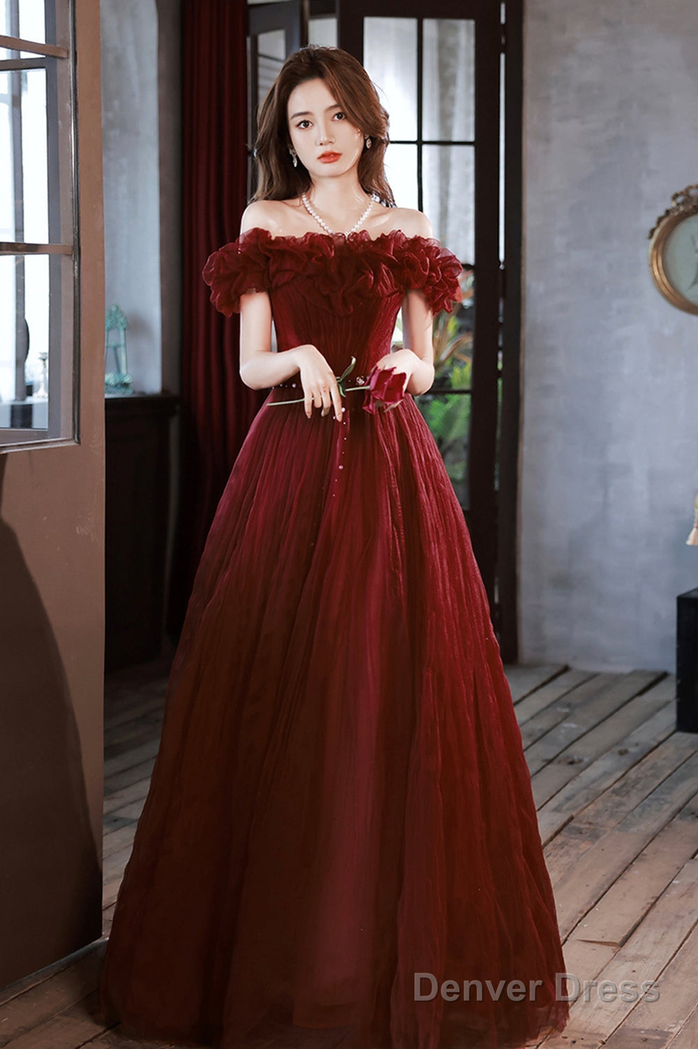 Burgundy Tulle Long A-Line Prom Dress, Cute Off The Shoulder Evening Dress