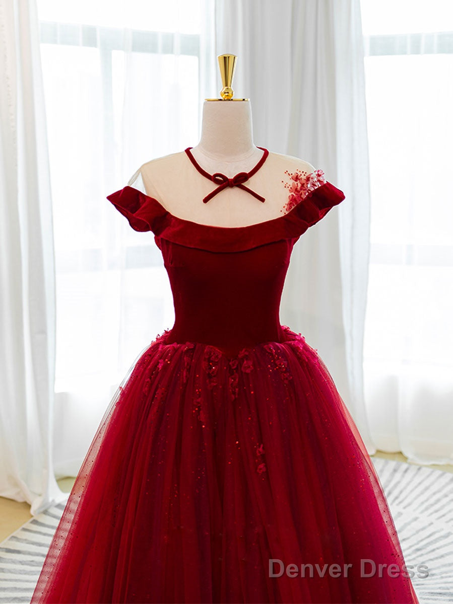 Burgundy Tulle Off Shoulder Long Prom Dress, Burgundy Tulle Formal Dress