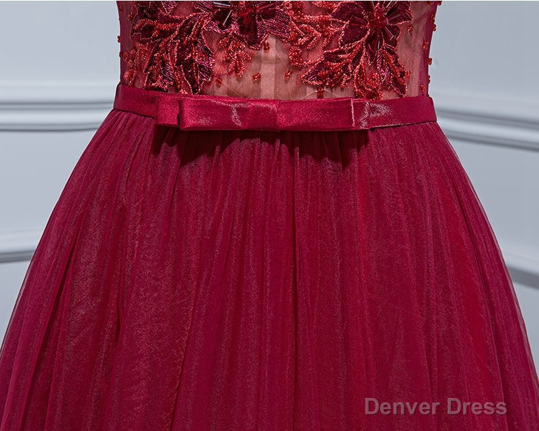 Burgundy V Neck Tulle Lace Long Prom Dress, Burgundy Evening Dress
