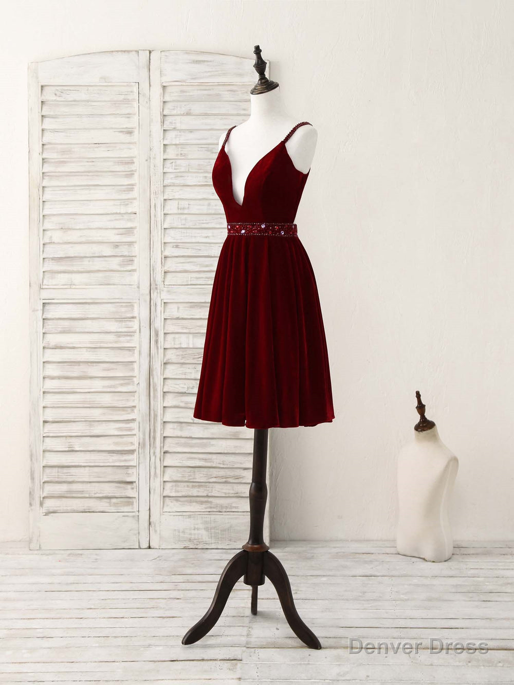 Burgundy V Neck Velvet Short Prom Dress, Burgundy Homecoming Dress