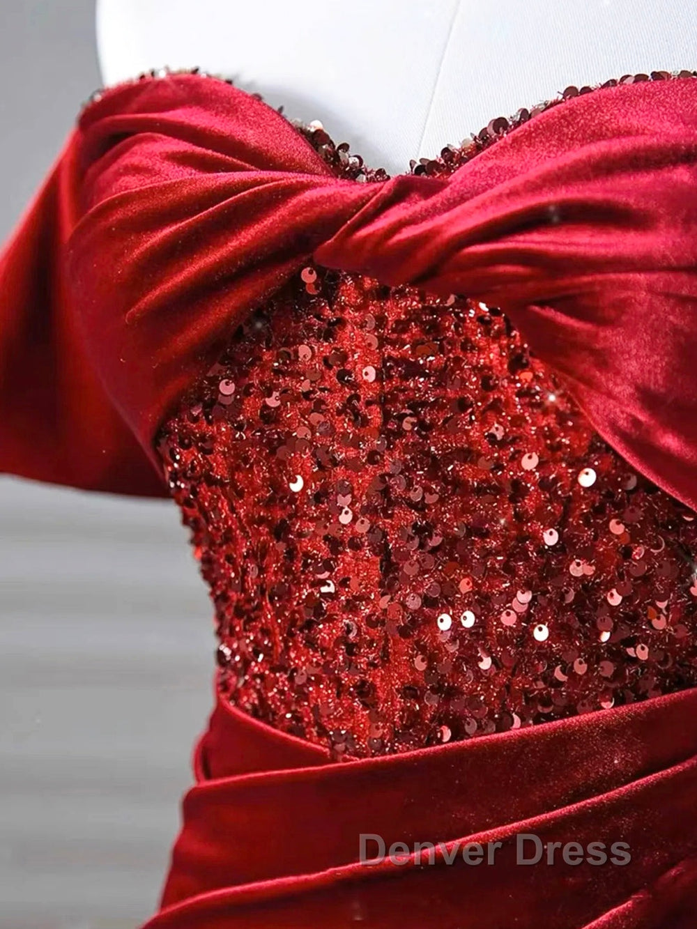 Burgundy Velvet Sequins Long Prom Dresses, Mermaid Off The Shoulder Party Dresses With Slit