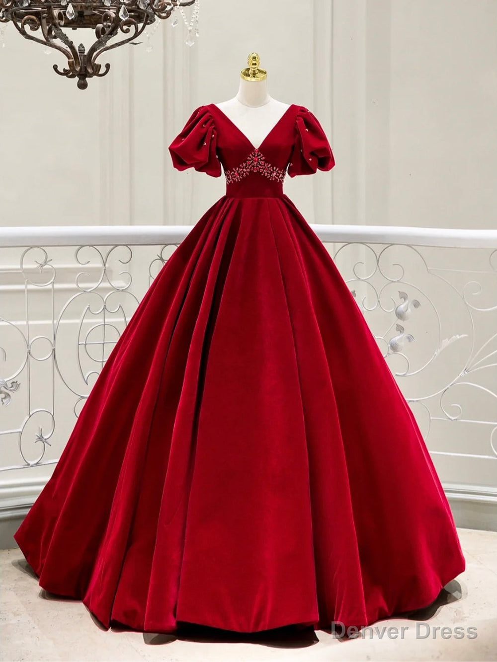 Burgundy Velvet V-Neck Long Formal Dress, A-Line Short Sleeve Evening Party Dress