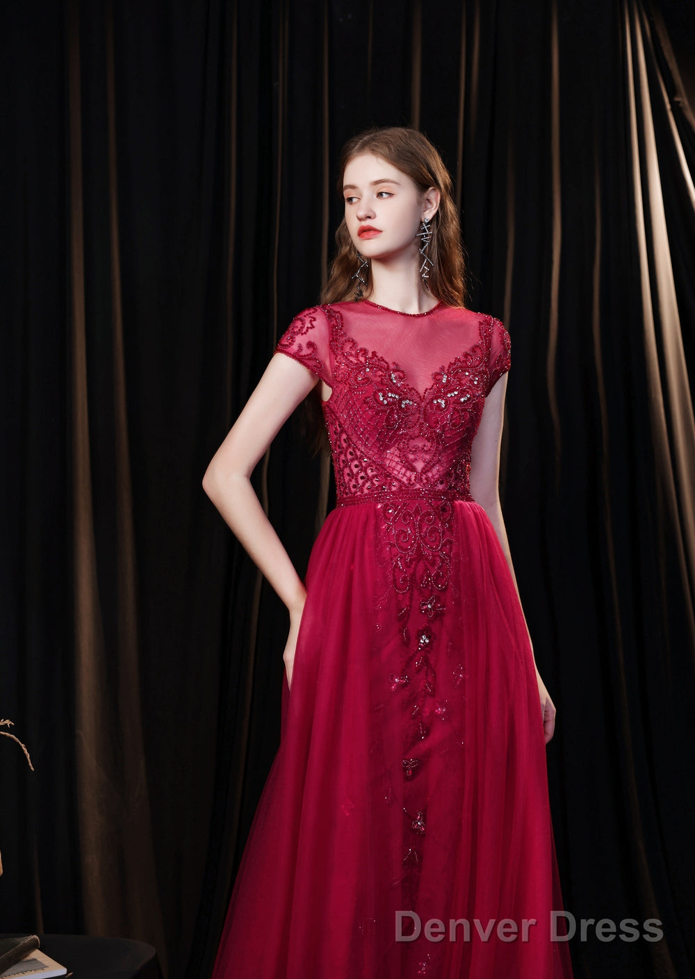 Cap Sleeves Prom Dress 2025聽Beading Appliques Tulle Scoop Floor Length Burgundy Prom Dresses