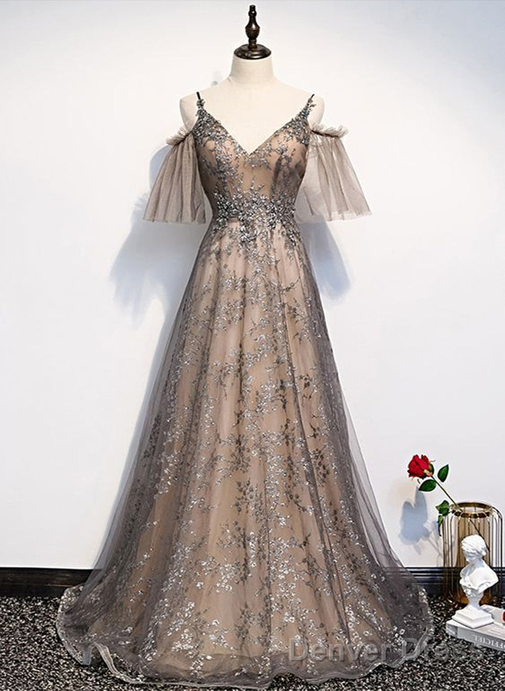 Champagne A-Line Straps Lace Low Back Prom Dress, A-Line Evening Dress