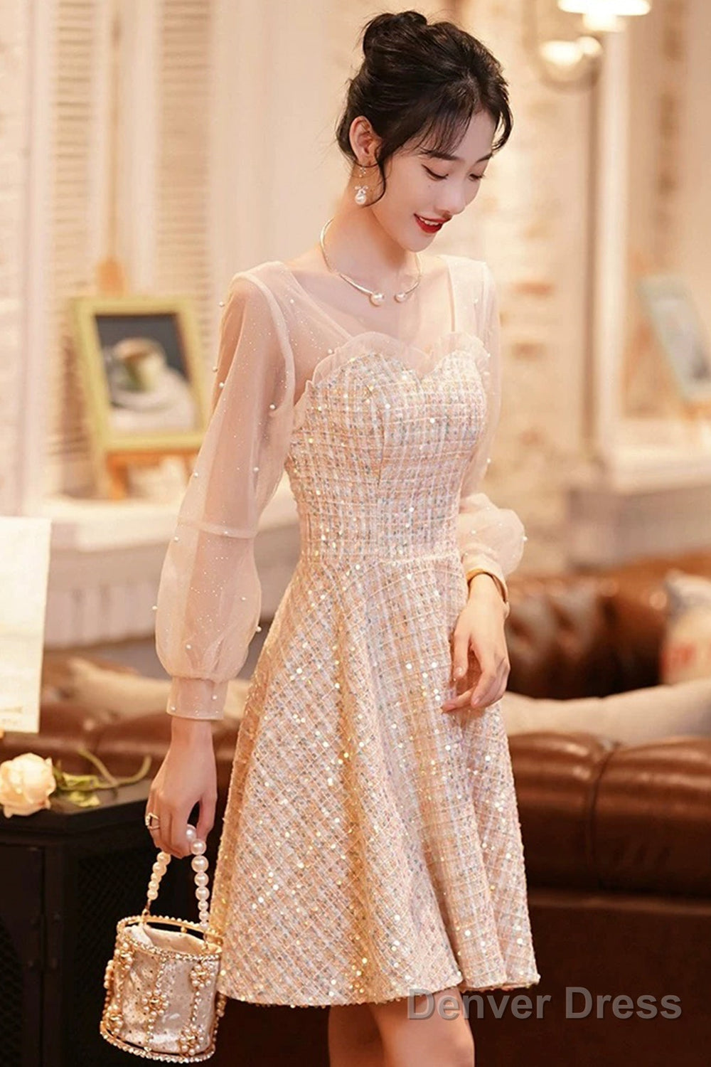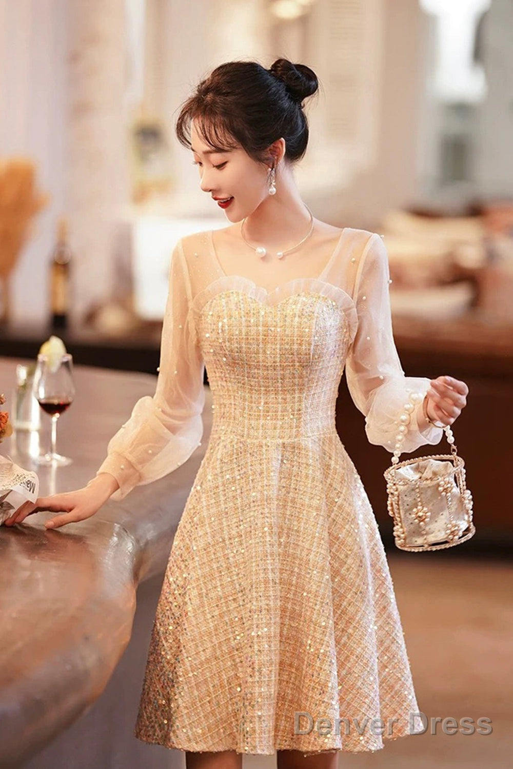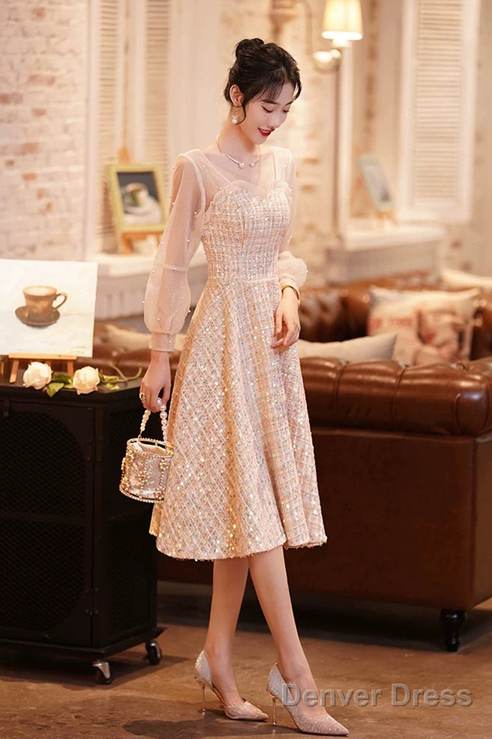 Champagne Long Sleeve Party Dress, Beautiful Knee/Tea Length Prom Dress