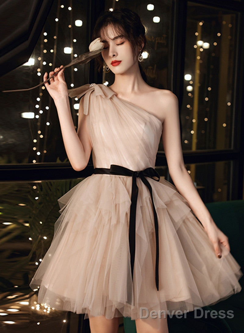 Champagne One Shoulder Tulle Short Party Dress, Short Homecoming Dresses