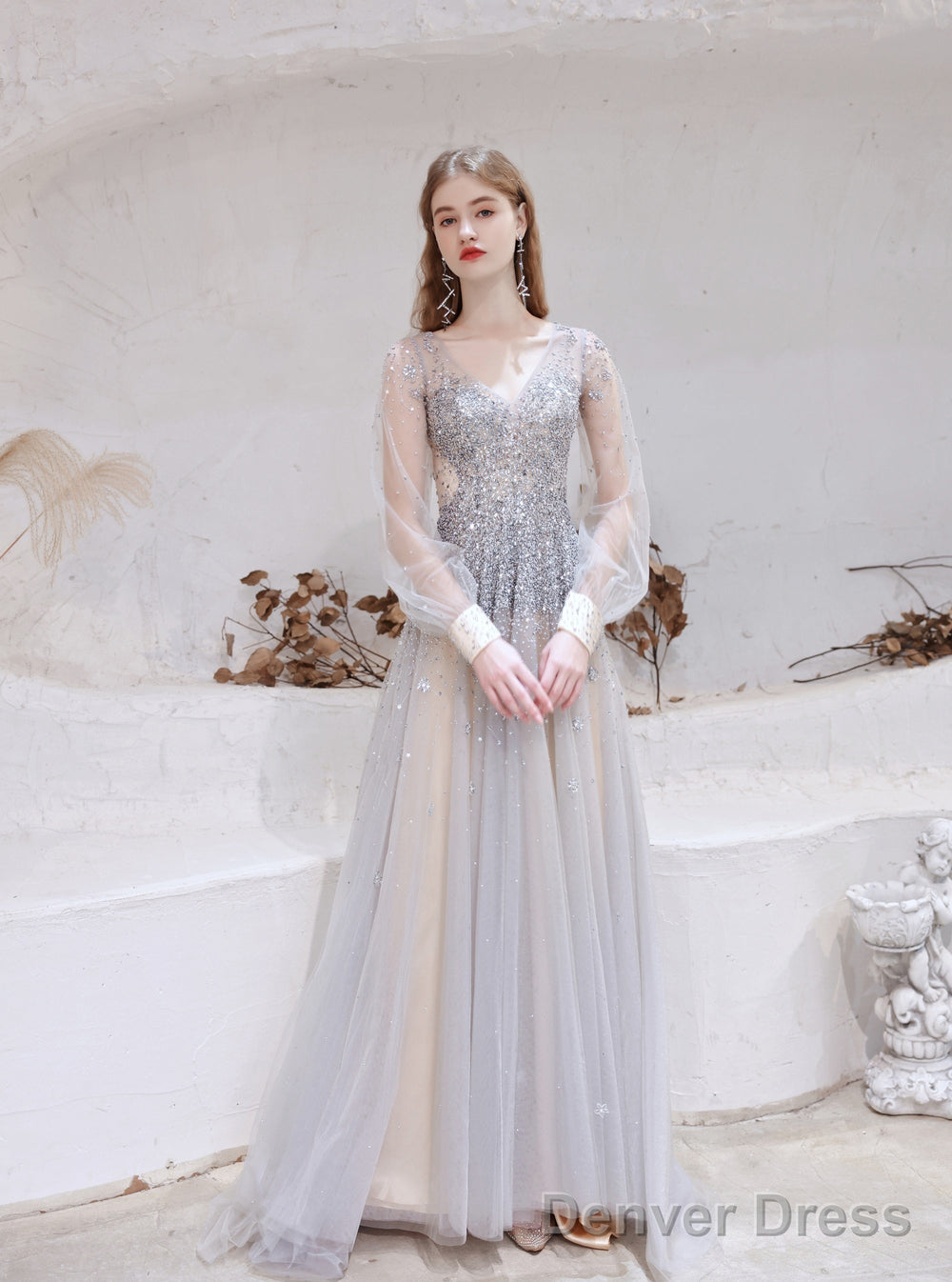 Champagne Prom Dresses Tulle Beading Luxury V Neck Long Sleeves Evening Dress 2025�Long Evening Party Dresses Women Robe De Luxe Femme Backless A Line Prom Gown