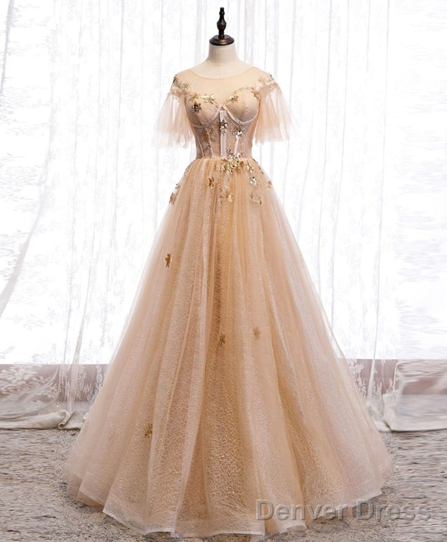 Champagne Puffy Sleeves Tulle Long Evening Dress Party Dress, A-Line Tulle Prom Dresses