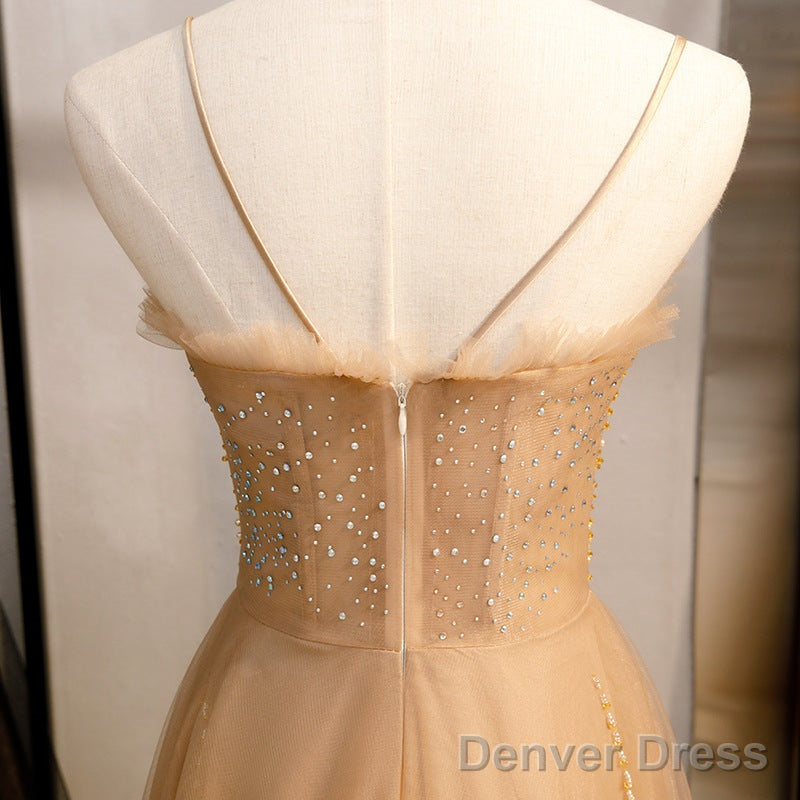 Champagne Sequins Tulle Straps Long Evening Dress Party Dress, Sweetheart Prom Dress