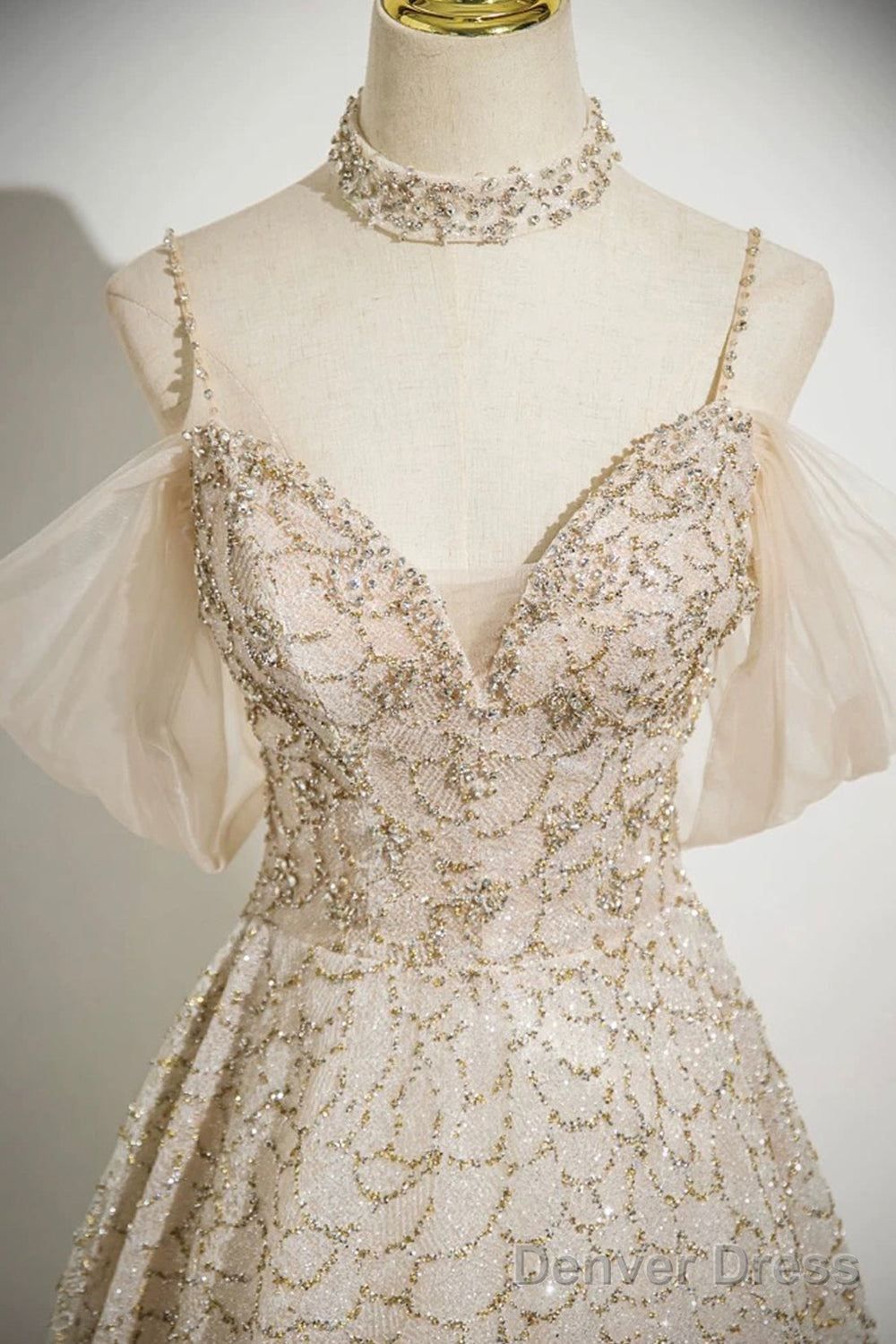 Champagne Spaghetti Strap Tulle Long Prom Dress, Shiny A-Line Evening Dress