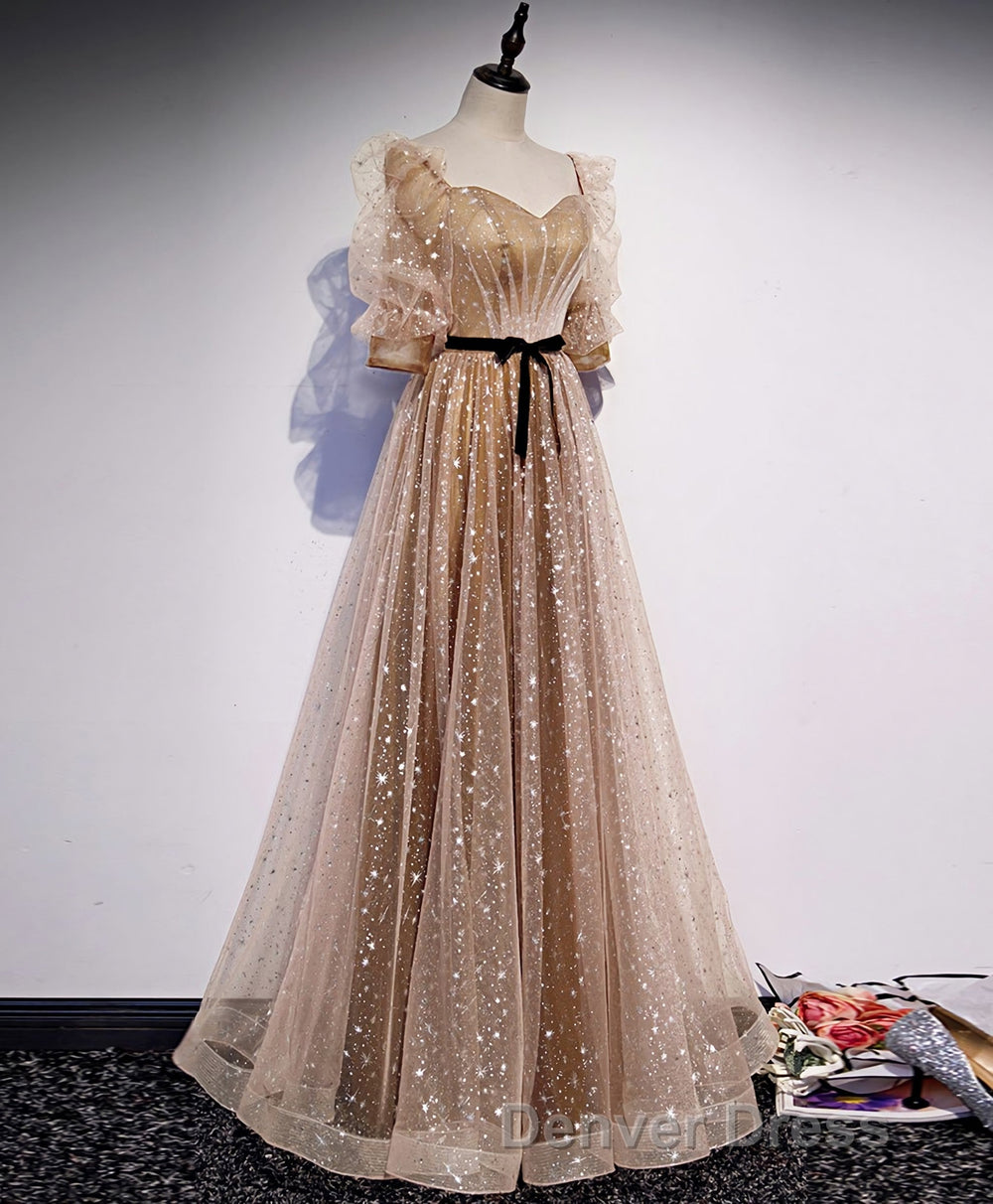 Champagne Sweetheart Tulle Long Prom Dresses, Tulle Formal Dresses