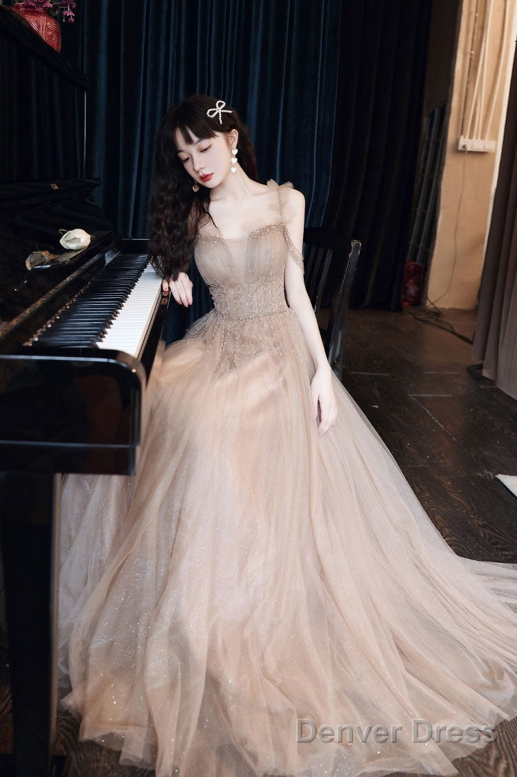 Champagne Tulle Beads Long Prom Dress, Champagne Evening Dress