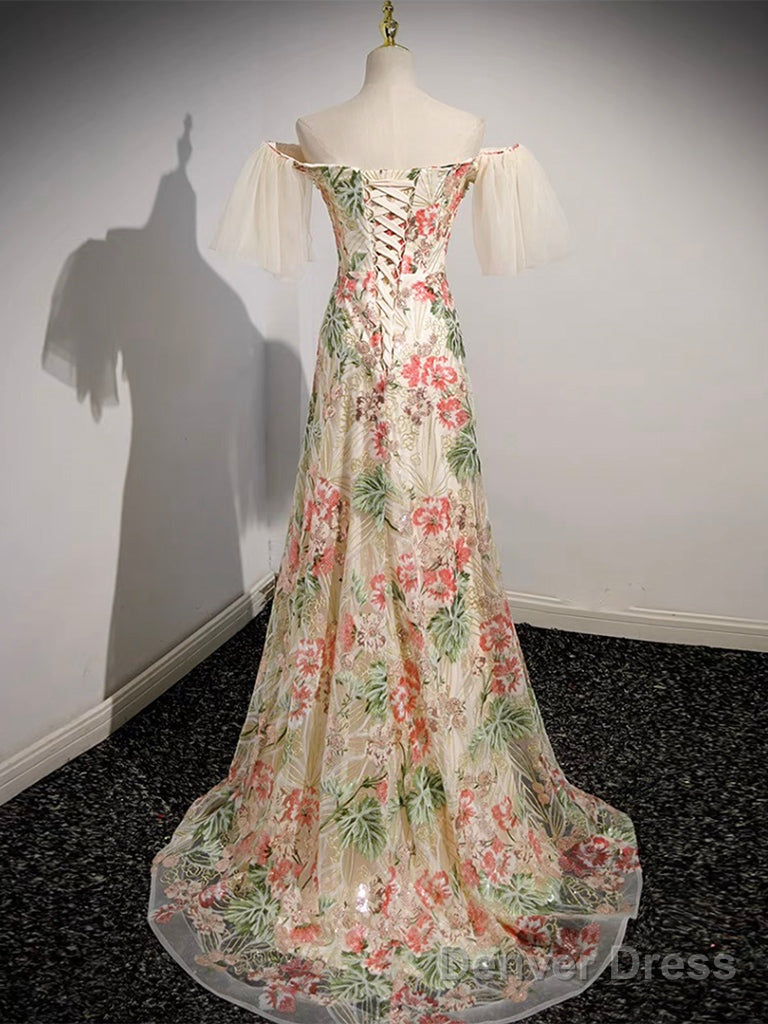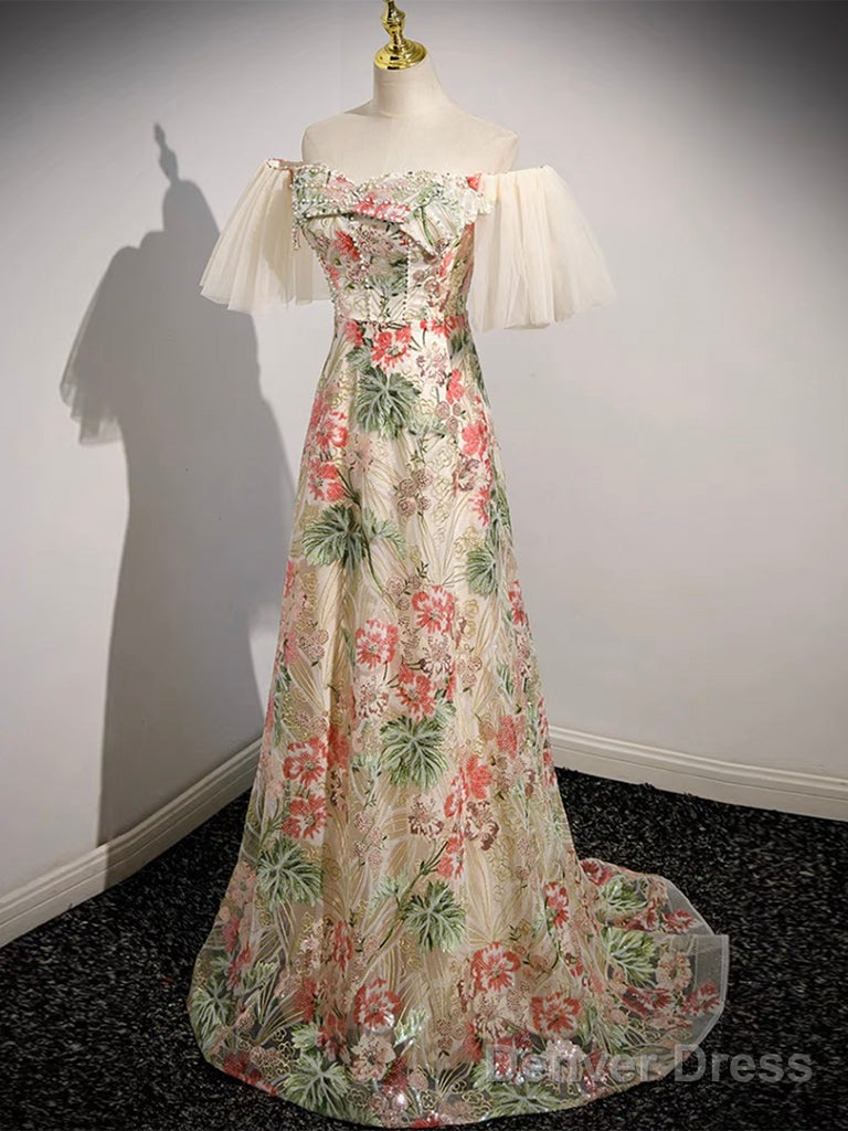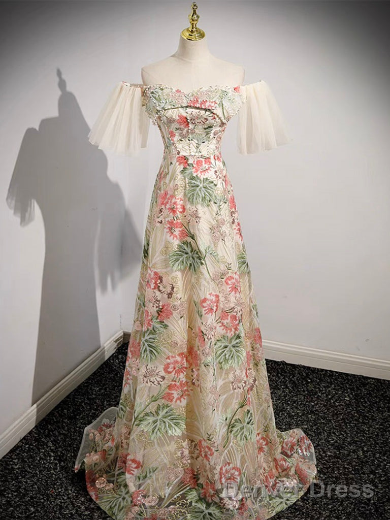 Champagne Tulle Lace Long Prom Dress, Champagne Long Formal Dress