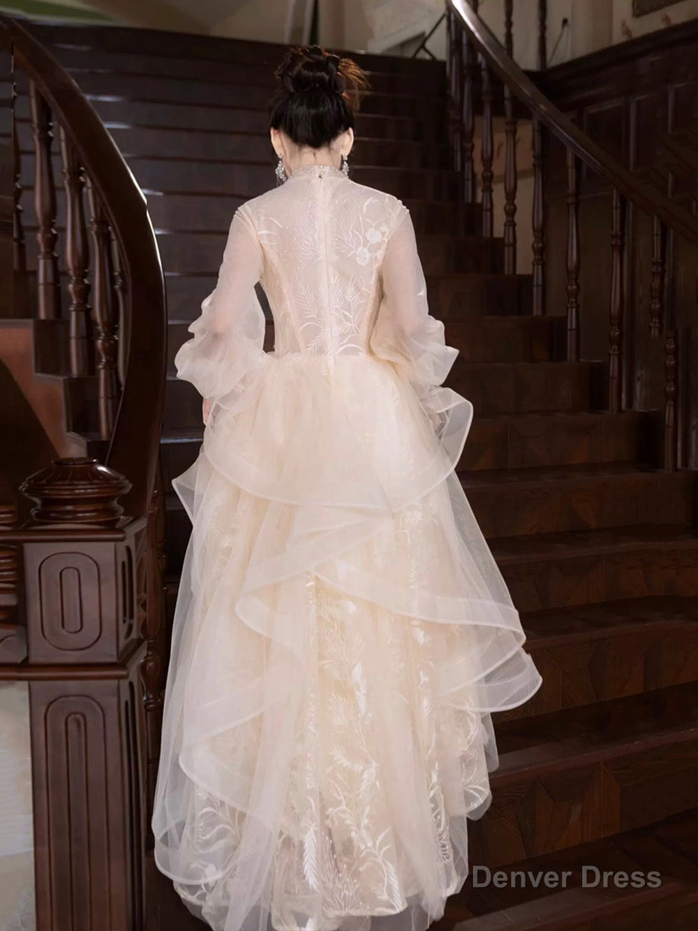 Champagne Tulle Long Sleeve Evening Party Dress